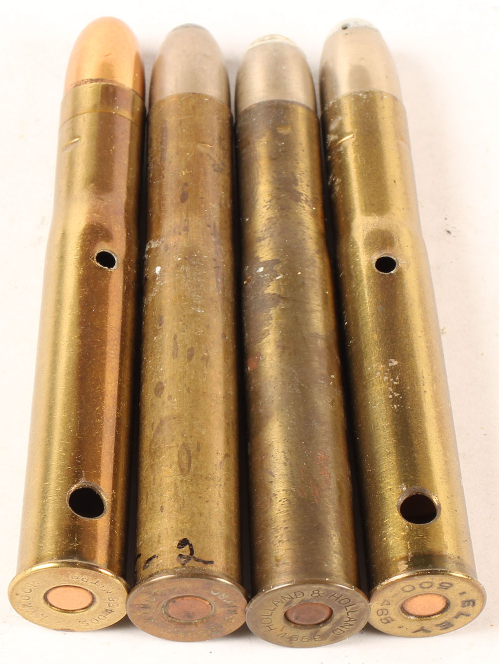 Lot of 4. 500-465 Nitro. (1) HS:''ELEY . .500-465 .'', RN CN SP, two non-factory holes in case. (1) HS:''KYNOCH 500-465 NITRO'', RN CJ FMJ, two non factory holes in case. (1) HS:''KYNOCH 500-465 NITRO'', RN CN SP. (1) HS:''HOLLAND & HOLLAND 465E'', RN CN SP. Grade Very Good - Value: 10 to 60