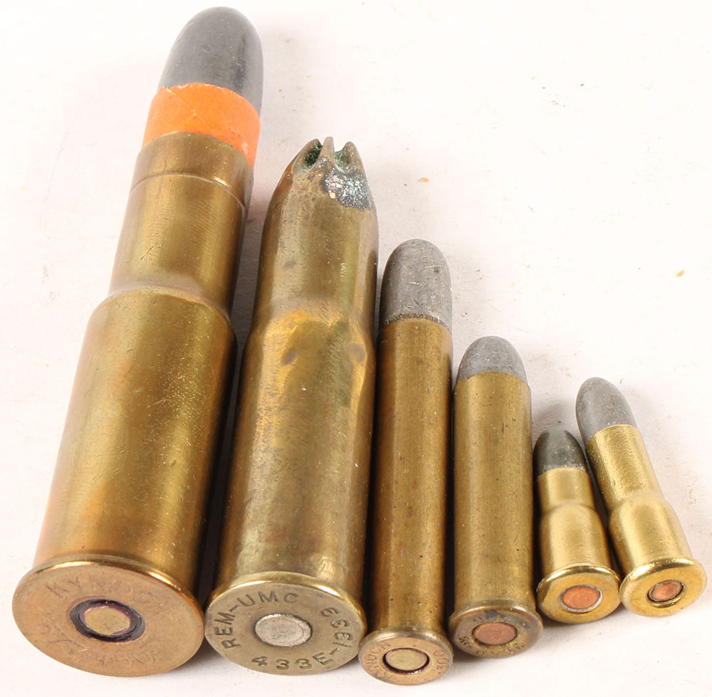 Lot of 6, British Sporting Cartridges. (1) .300 Sherwood, HS:''KYNOCH 300'', RN Lead. (1) .300 Rook, HS:''U.M.C. 30 ROOK'', RN Lead. (1) 577/450 Martini, HS:''KYNOCH 577/450'', RN PP Lead (orange paper patch). (1) .433 Egyptian Remington Riot Shot, HS:''REM-UMC 433E-1939'', Seven petal crimp. (1) .297/230 Morris Short, NHS, RN Lead. (1) 197/230 Morris Long, NHS, RN Lead. Grade Very Good - Value: 20 to 40