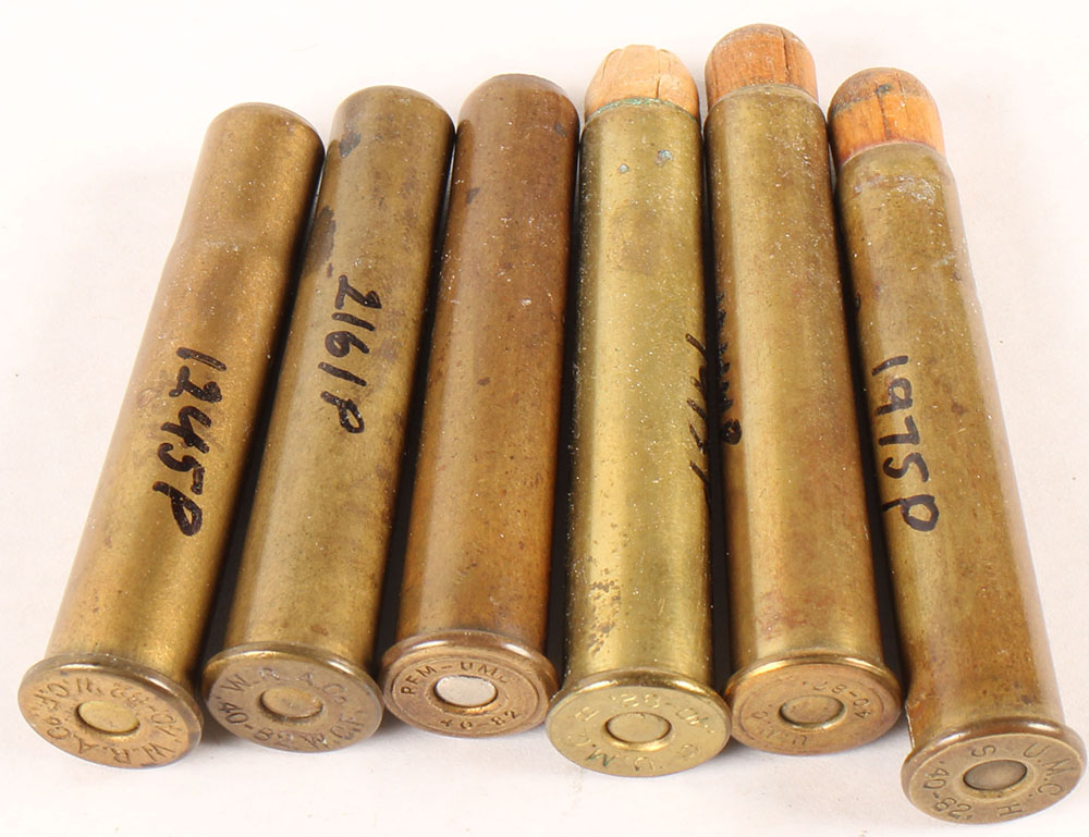 Lot of 6, 40-82 Winchester. All Shot Cartridges. (2) HS:''W.R.A.Co. 40-82 W.C.F.'', Wads at casemouth. (2) HS:''U.M.C. H 40-82 S'', 1--wood sabot, 1--Paper sabot. (1) HS:''U.M.C. 40-82'', wood shot sabot. (1) HS:''REM-UMC 40-82'', paper wad at casemouth. Grade Very Good - Value: 80 to 160