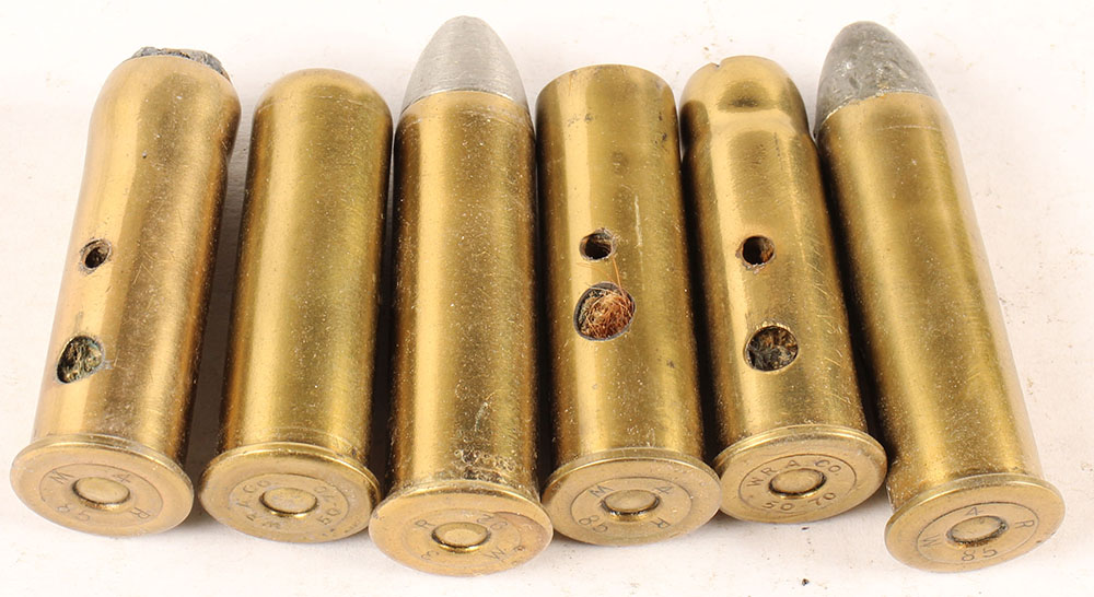 Lot of 6, 50-70 Govt. (3) HS:''R 85 W 4'', 1--FN Lead. 1--Blank. 1--Shot Load. (1) HS:''R 92 W 3', FN Lead. (2) HS:''W.R.A.Co. 50-70'', 1--SHOT LOAD. 1--BLANK. All have two non-factory holes in case. Grade Very Good - Value: 10 to 60