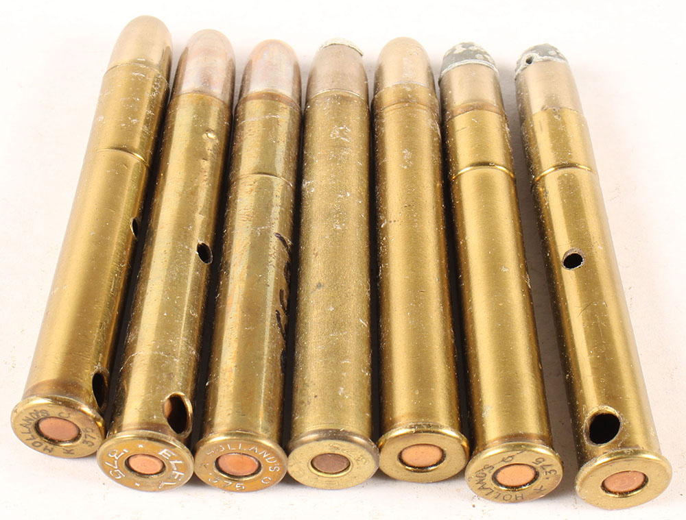 Lot of 7, .375x2.5'' Nitro Express. (2) NHS, 1--RN CN SP, 1--RN CN FMJ. (3) HS:''HOLLAND'S C .375 K'', 1--RN CN SP, 1--RN CN HP, 1--RN CN HP (larger than the one previous), (2) HS:''ELEY .375'', 1--RN CN FMJ, 1--RN CN SP. All except the last one have one or two non-factory holes in case. Grade Very Good - Value: 10 to 40