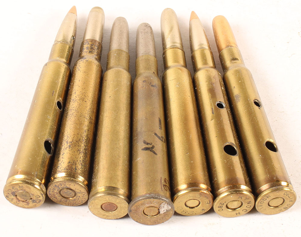 Lot of 7, British Sporting Cartridges. (6) .280 Ross, 4--By Kynoch, All different. 2--By Eley. (1) .280 Flanged, FN CN HP by Kynoch. All except one have two non-factory holes in case. Grade Very Good - Value: 10 to 40