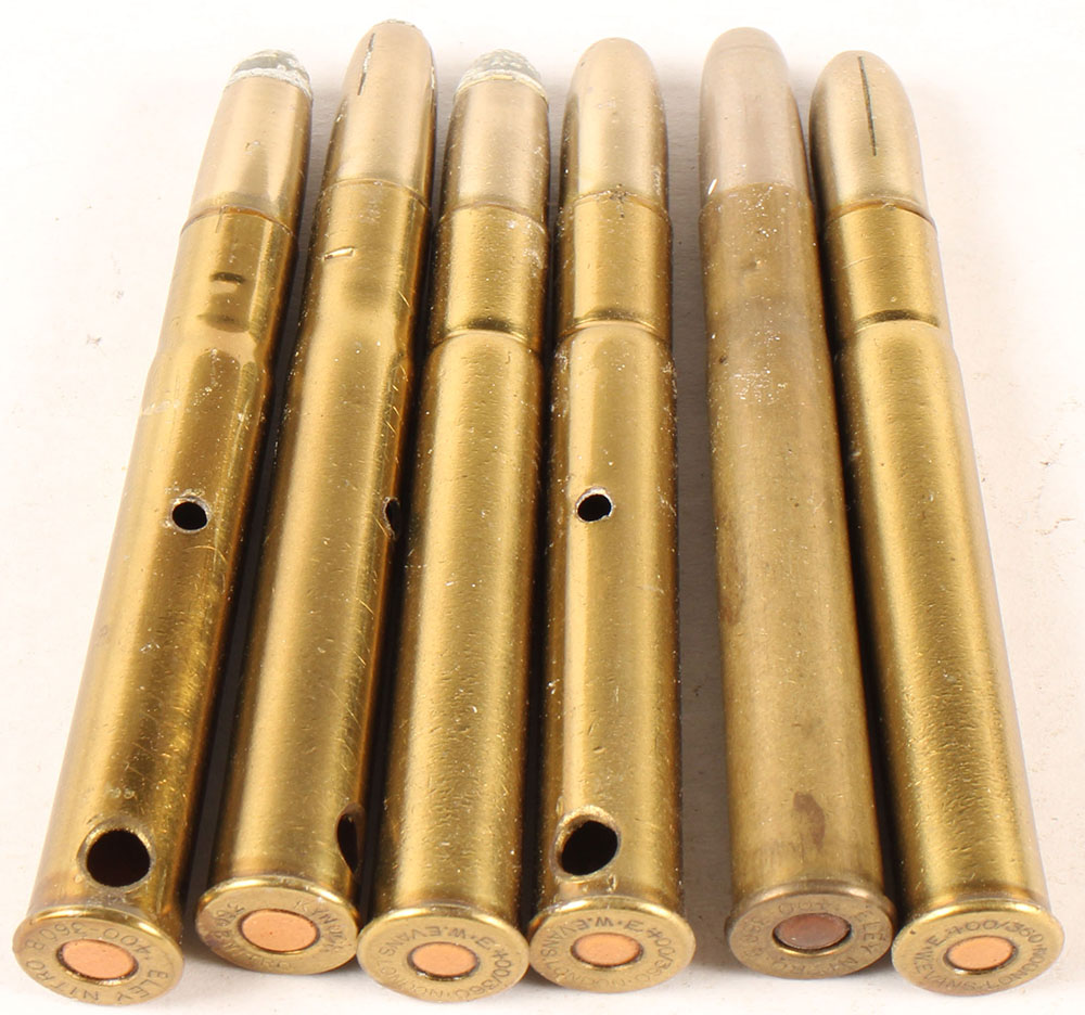Lot of 6, 400-360 Nitro. (3) HS:''E. 400/360.LONDON .W.EVANS.'', 1--RN CN SP, 1--RN CN FMJ, 1--RN CN SP w/ slits. (2) HS:''ELEY NITRO 400-360 B'', 1--RN CN SP, 1--RN CN FMJ. (1) HS:''KYNOCH 360 B NITRO'', RN CN SP w/ slits. 5 of the 6 have two non-factory holes in case. Grade Very Good++ - Value: 10 to 60