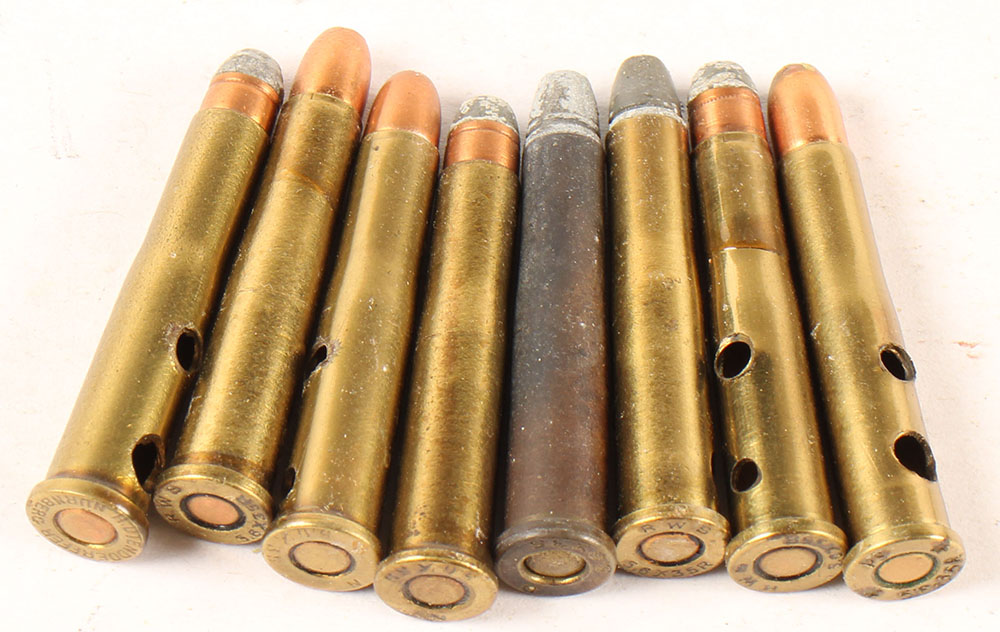 Lot of 8, 5.6 by 35mmR Vierling. Manufactured by RWS (5) all different, Utendoerffer (1), Povaske Strojarne (1), Gustav Genschow (1). All have one or two non-factory holes in case. Grade Very Good - Value: 10 to 30