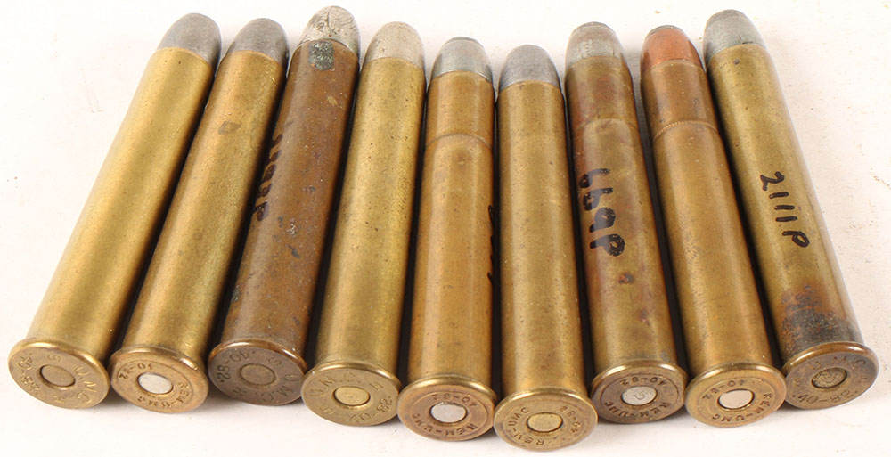 Lot of 9, .40-82 Winchester. All different as to bullet and/or primer. (5) HS:''REM-UMC 45-82'', (4) HS:''U.M.C. H 40-82 S''. Grade Very Good. - Value: 60 to 120