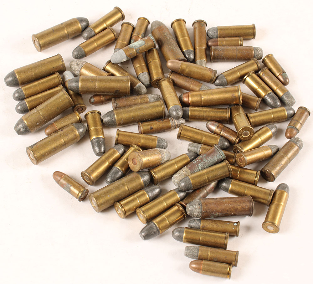 Lot of 67 Pistol & Revolver Cartridges. (9) .45 Colt Revolver, (2) .44 Webley Revolver, (6) .38 Colt New Police, (23) .38 Long Colt, (9) .32 Colt New Police (snapped primers), (3) .41 Colt, (1) .44 Winchester, (1) .30 Luger, (2) .32 S&W Long, (9) .32 ACP, (2) .32 Long Colt. Grade: Very Good - Value: 20 to 40