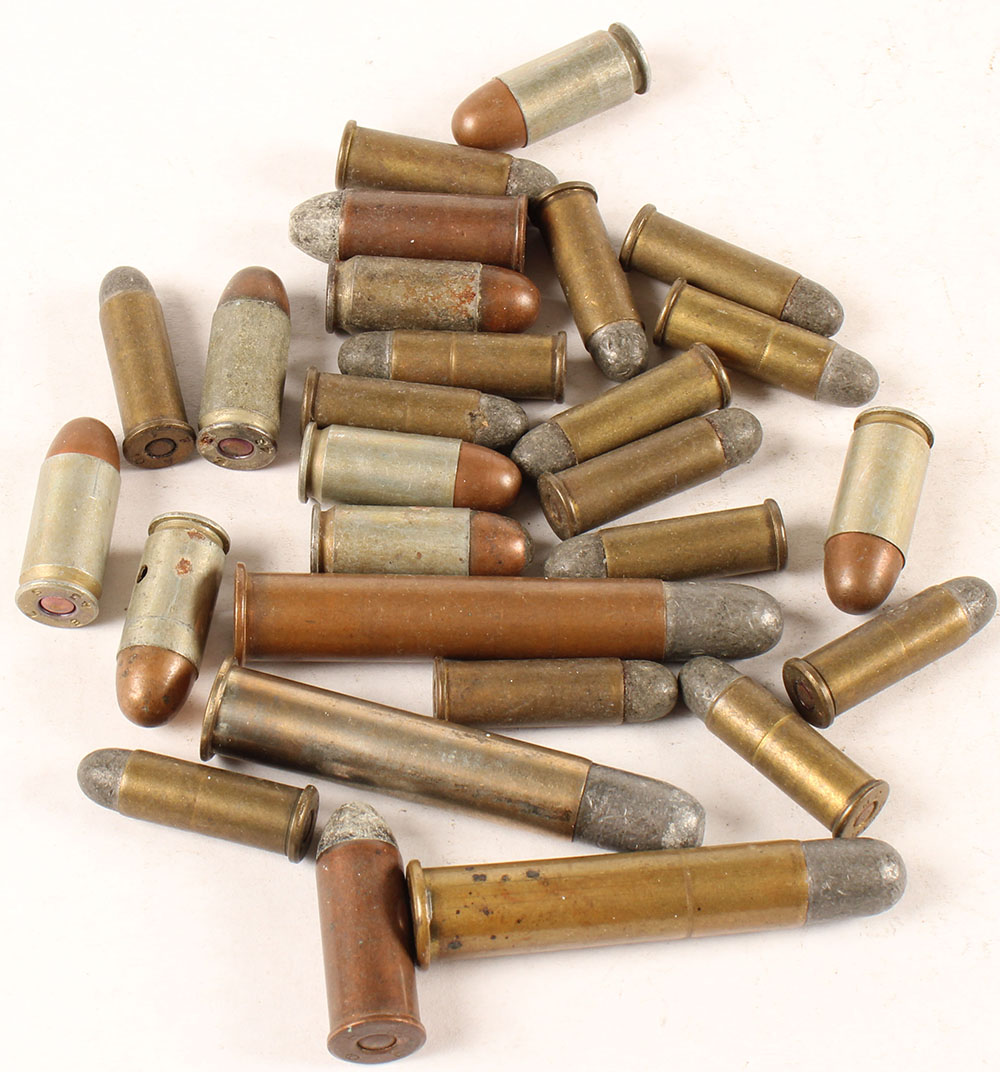 Lot of 27, mixed US military caliber cartridges. (14) .38 Colt, RN Lead, 8--Commercial, 5--Military headstamps. (8) .45 Auto Colt. 4--Ball by ''ECS'', 3--Ball by ''EC'', 1--Dummy by ''EC''. (2) .45 Schoefield, HS:''R 83 F 6'', FN Lead. (2) 45-70 Govt, 1--Military, HS:''F 97 5'', RN Lead. 1--Commercial, HS:''U.S.C.Co. 45-70'', RN Lead. (1) 45-80 (2.4'' case), HS:''R 82 F 9'', RN lead. Grade Very Good - Value: 20 to 40