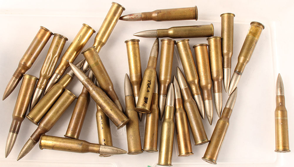 Lot of 29, 7.62x54mm Mosin Nagant. (14) Russian headstamps, all with PT CN FMJ. (13) Finish by ''VPT'', 12--w/ PT CNCS FMJ, One is a Finnish dummy, 1--PT CN FMJ. (2) British, one by Kynoch and the other by Greenwood Batley, PT CN FMJ. Grade Very Good - Value: 20 to 60