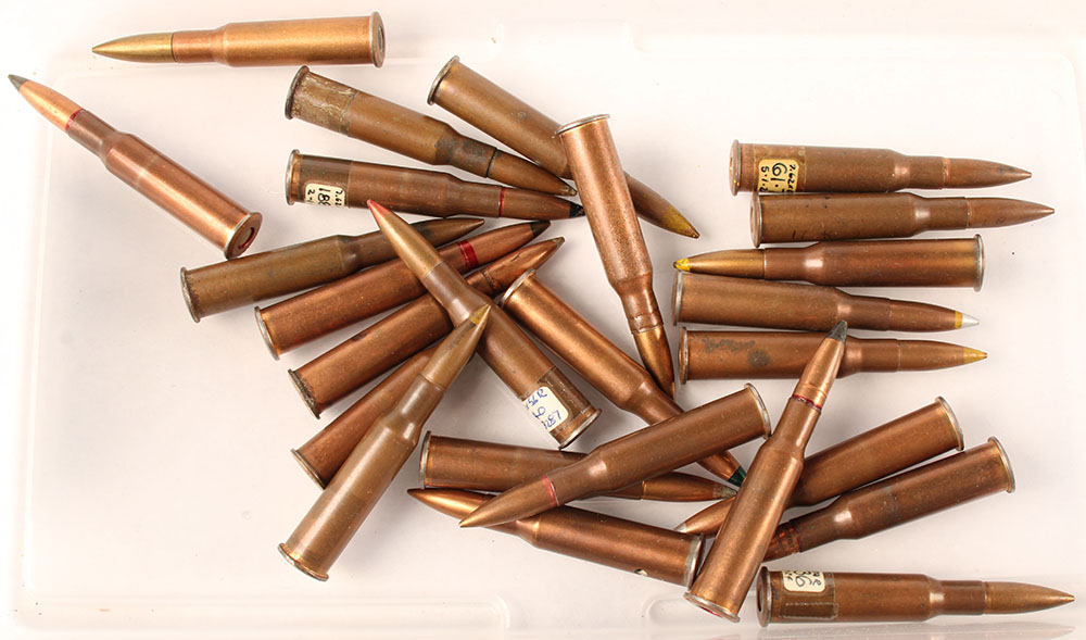 Lot of 25, 7.62x54mm Mosin Nagant. All with copper wash steel cases. Numerous headstamps and bullet loadings. See Photo. Grade Very Good. - Value: 10 to 40