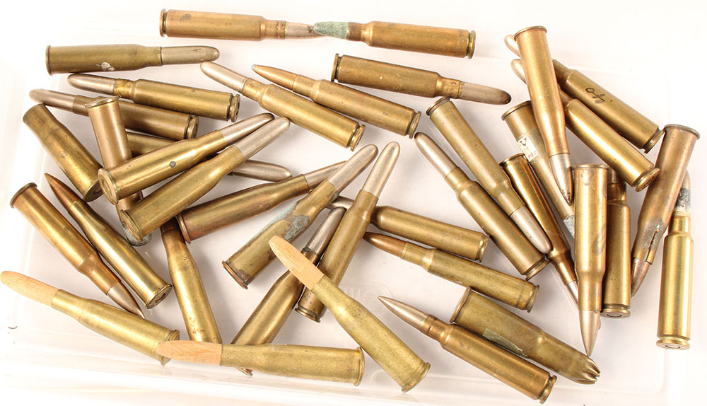 Lot of 38, Mixed European Military Ammunition. (13) 7.5MM Swiss. (9) 8mm Kropochek. (4) 7mmk Mauser. (3) 8x56mm Mannlicher. (3) 8mm Danish Krag. (2) 11mm Danish Remingtons. (2) 11mm Egyptian Remingtons. (1) 8x50mm Mannlicher. (1) 7,9x57mm Mauser. See Photo, Grade Very Good - Value: 20 to 40