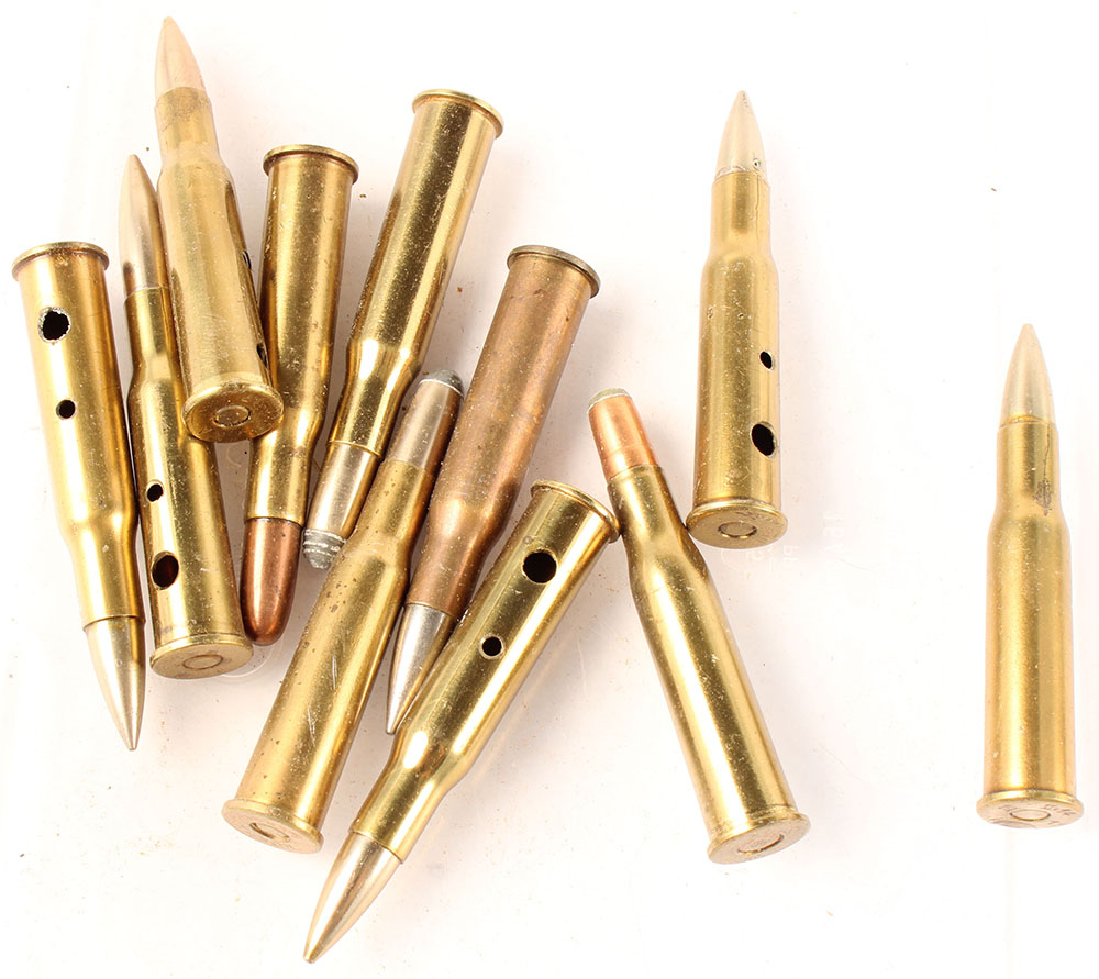 Lot of 11, 8x58mmR Danish Krag. (7) Danish Military cartridges with dates ranging from 1911 to 1941. (1) NHS, probable Swedish for Remington rifles. (3) SP rounds by RWS, Norma and surplus military case. All have two non-factory holes in case. Grade Very Good - Value: 20 to 40