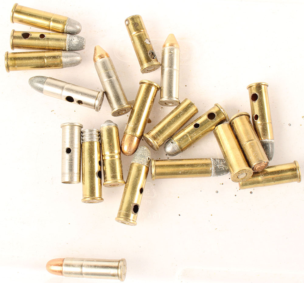 Lot of 20, .38 S&W Special. Assorted headstamps and bullet loadings. Mostly US manufacture but with some European. Includes a steel case by PACIFIC. All have at least one hole in case. Grade Very Good - Value: 4 to 30