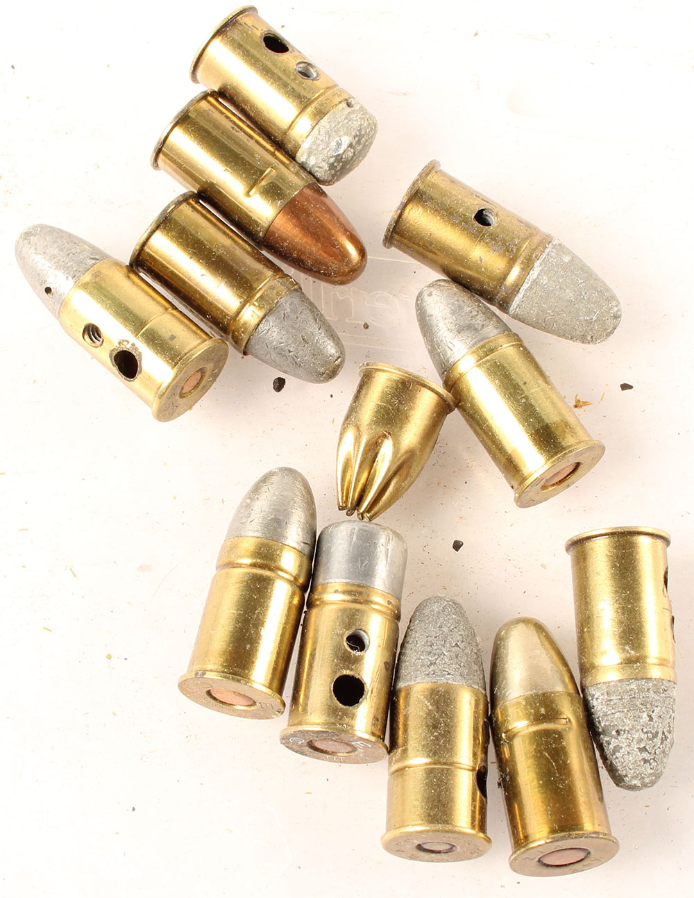 Lot of 12, .455 Revolver. One each of: manstopper, target load by RWS, blank, by WRA Co., by UMC, and 7 military loadings. Most have two non factory drilled holes in case. Grade Very Good - Value: 20 to 40