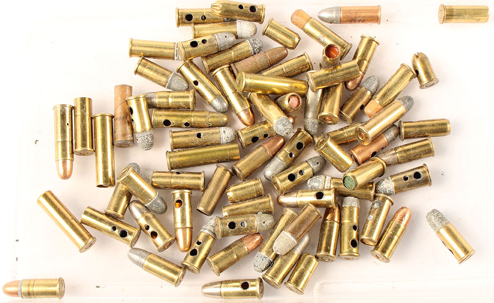 Lot of 74 Revolver Cartridges. .38 Caliber. A mixed lot of cartridges including of .38 Colt NP, Long Colt, .380 Revolver, 38 S&W, 38-44 target, 38 M&H. Different types, bullet loadings and headstamps. Most have two holes in case. Grade Very Good - Value: 10 to 40