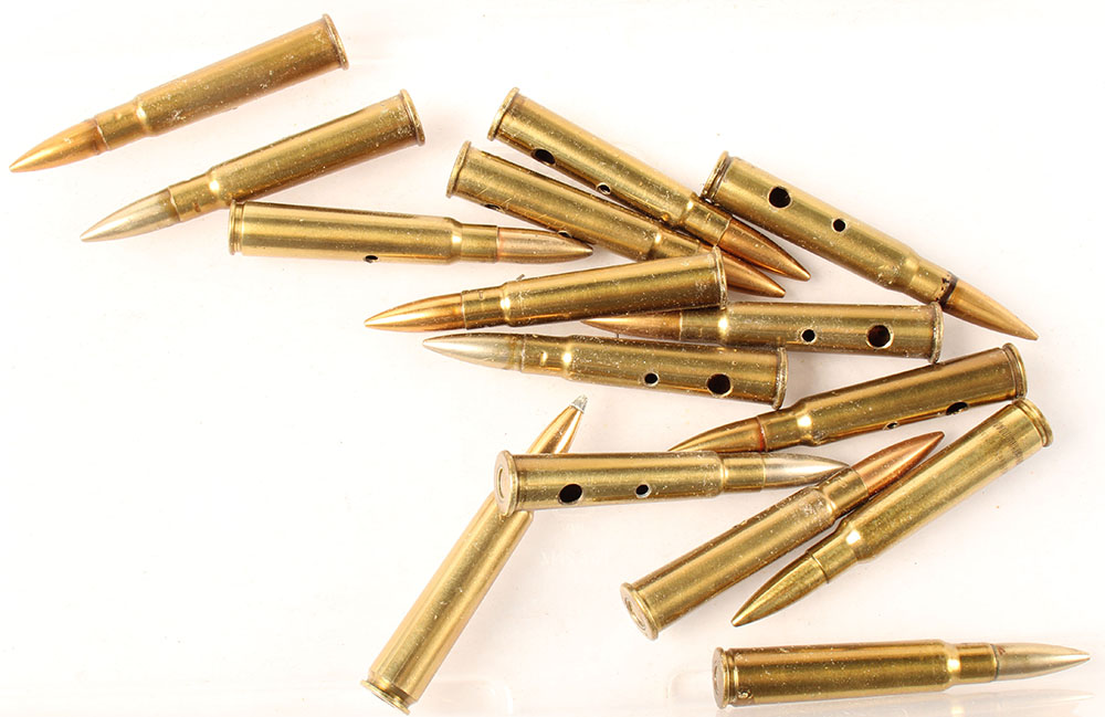 Lot of 15. Japanese Military Cartridges. (9) 7.7mm Rimmed, a mix of Japanese arsenal codes and loadings. (3) 7.7mm Semi Rimed MG, includes one dummy. (2) 7.7mm Rimless commercial with NORMA headstamps. (1) 7.9x57 Mauser, NHS & black casemouth seal. All of these have at least one non-factory hole in case. Grade Very Good - Value: 20 to 40