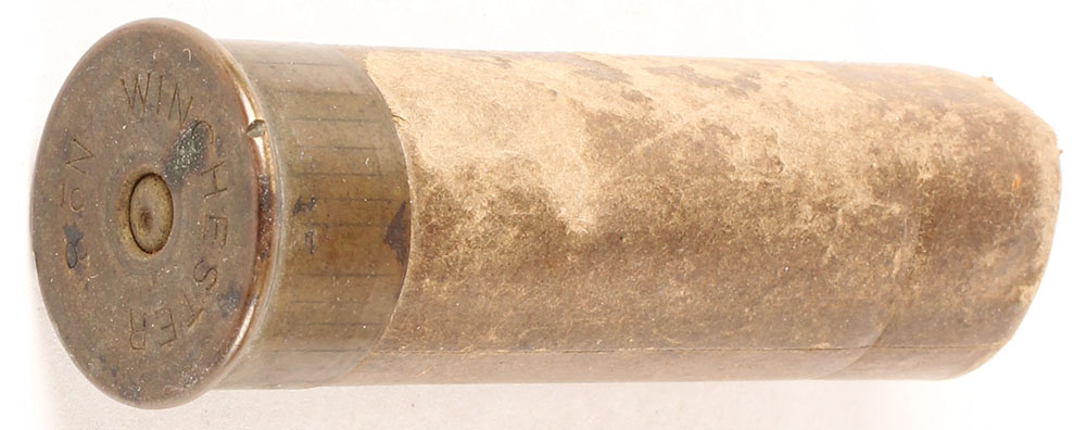 Winchester No 8ga, Loaded, blank top wad with dented primer, 3'' OAL. Loaded grey paper. Grade: Good ++ - Value: 10 to 30