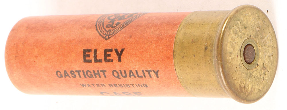 ELEY-NNOBLE No. 8ga, 3'' OAL. Loaded red paper case with printing, TW 3 shot. Grade: Excellent - Value: 20 to 80