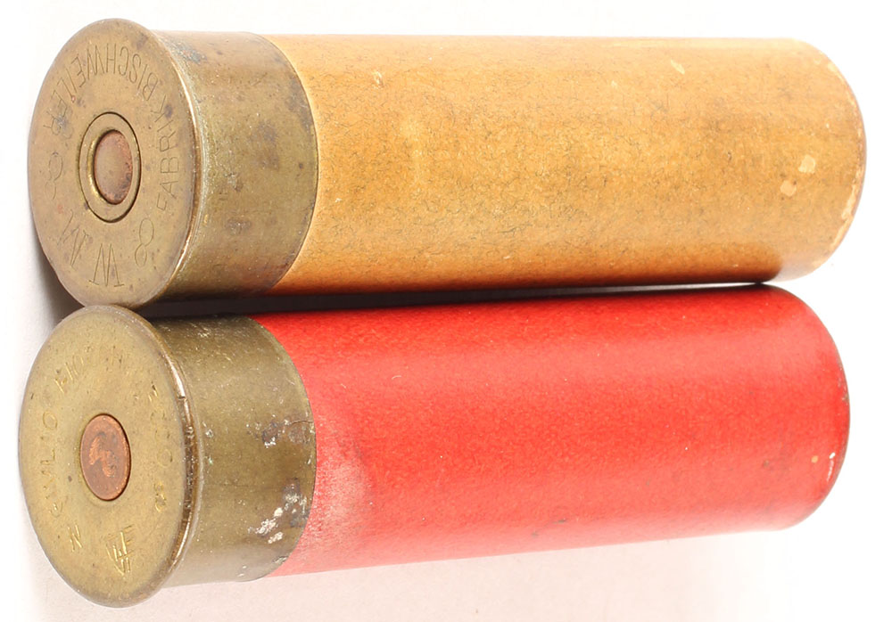 Lot of 2 loaded 8ga shells, WM 8 FABRIK BISCHWEILER, BB shot, GIVLIO FIOCCHI LECCO 8, with a blank tan TW. Grade: Very Good ++ - Value: 20 to 100