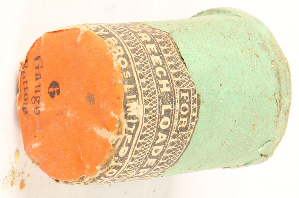 Early Eley's wire and concentrator shot loads. The Eley Brothers began designing shot in the 1820s in London and the company is still in business today and located in Birmingham. Civil Wire Paper wrapped Eley 6 gauge wire shot shell. Base of the cartridge is marked: 6 Gauge Bottom on an orange tag. Grade: Excellent - Value: 10 to 50