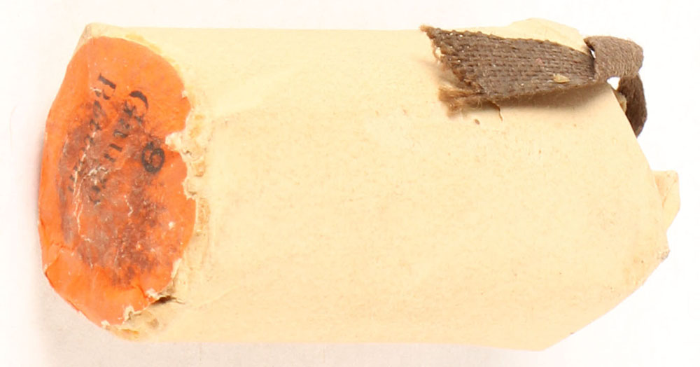 Early Eley's wire and concentrator shot loads. The Eley Brothers began designing shot in the 1820s in London and the company is still in business today and located in Birmingham. Civil Wire Paper wrapped Eley 9 gauge wire shot shell. Base of the cartridge is marked: 9 Gauge Bottom on an orange tag. Grade: Excellent - Value: 10 to 50