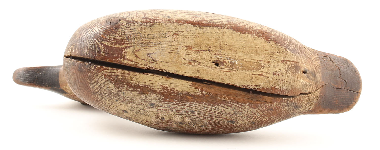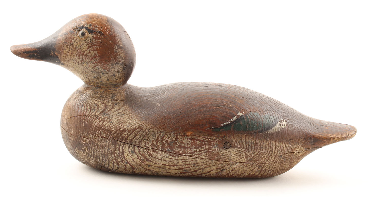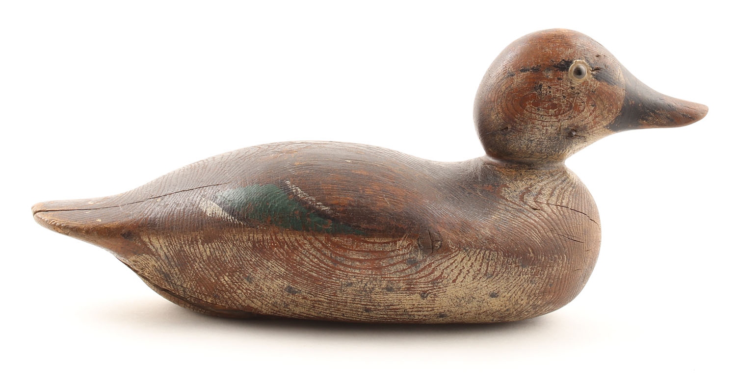 Green Wing Teal Hen by Mason Decoy Company, Detroit, MI, glass eyes, solid wood with some grain cracks, bottom is split, original paint, wear from age & use, name faintly stamped on bottom, 12'' OAL. Grade: Very Good - Value: 150 to 400