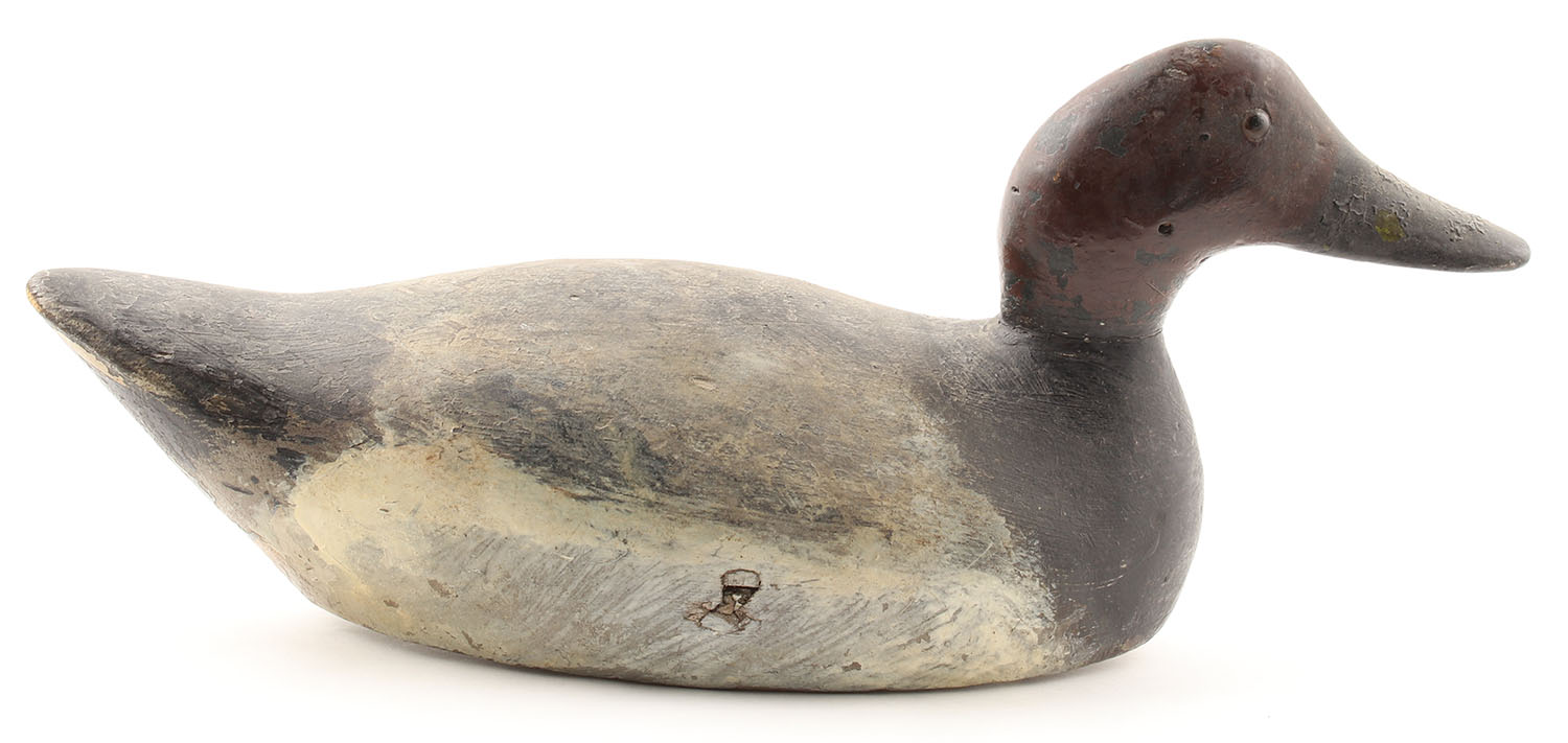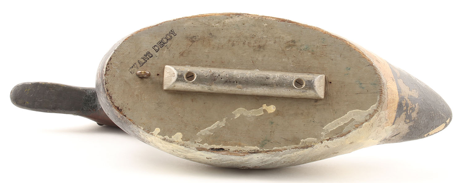 Canvasback Drake by Evans Decoy Co., Ladysmith, WI, glass eyes, hollow wood, repainted, name stamped on bottom, has weight & eyelet, 15'' OAL. Grade: Excellent - Value: 100 to 300