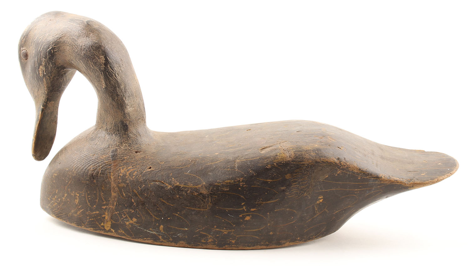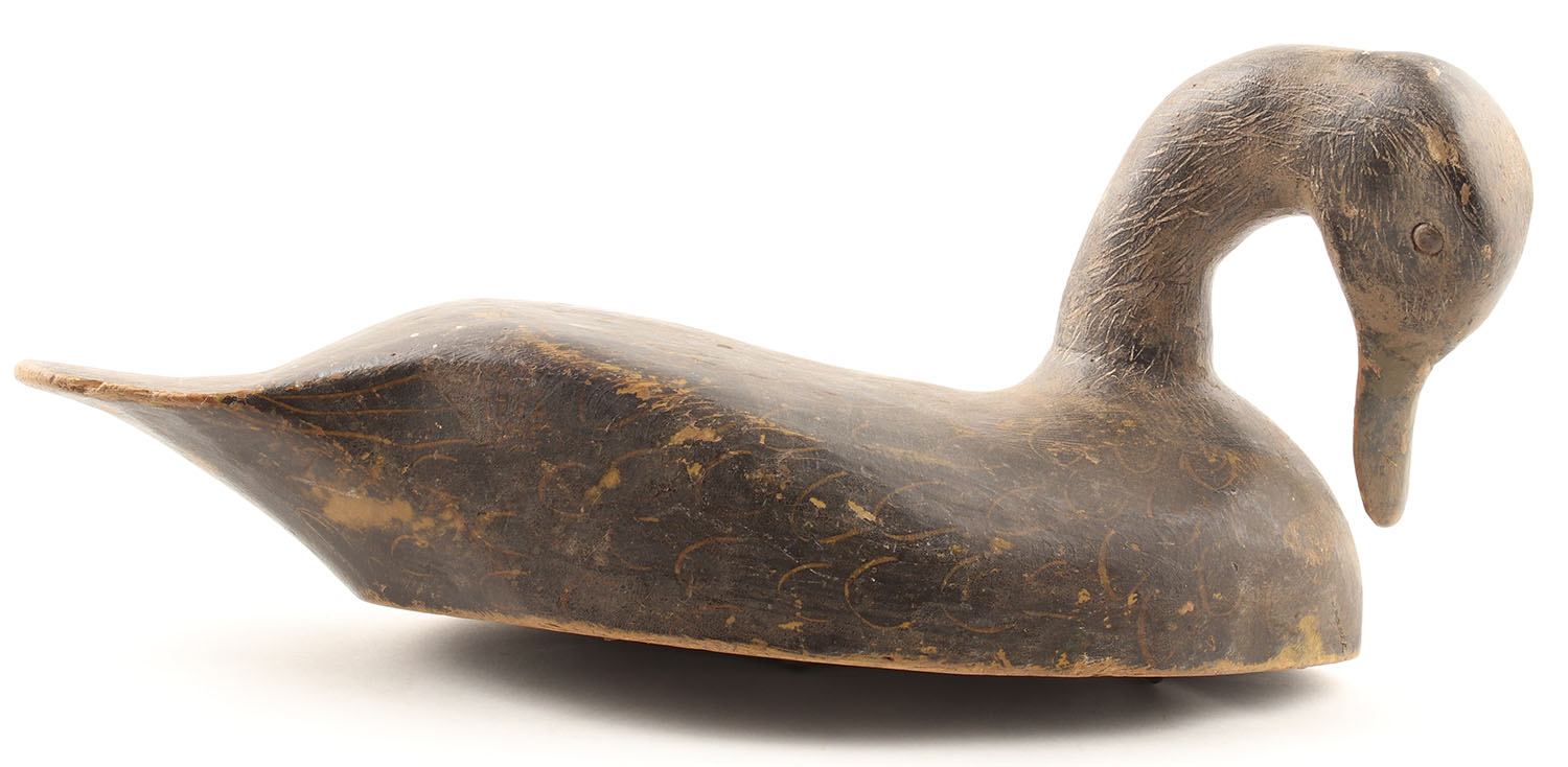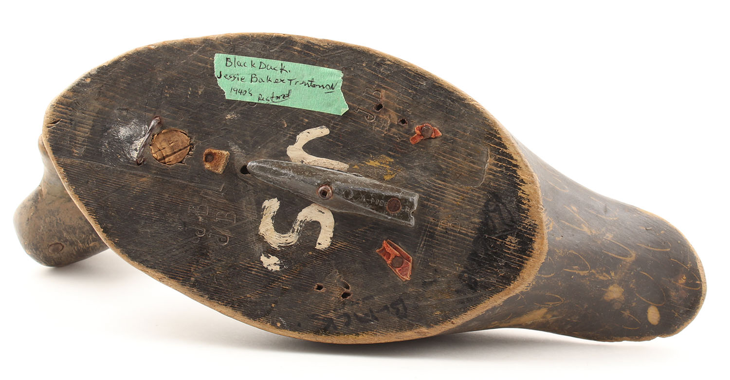 Preening Black Duck by Jesse Baker, Trenton, Canada, circa 1940's, restored, tack eyes, hollow wood, older restoration paint, structurally excellent, branded on bottom, remnants of leather straps, 15 1/2'' OAL. Grade: Excellent - Value: 50 to 100