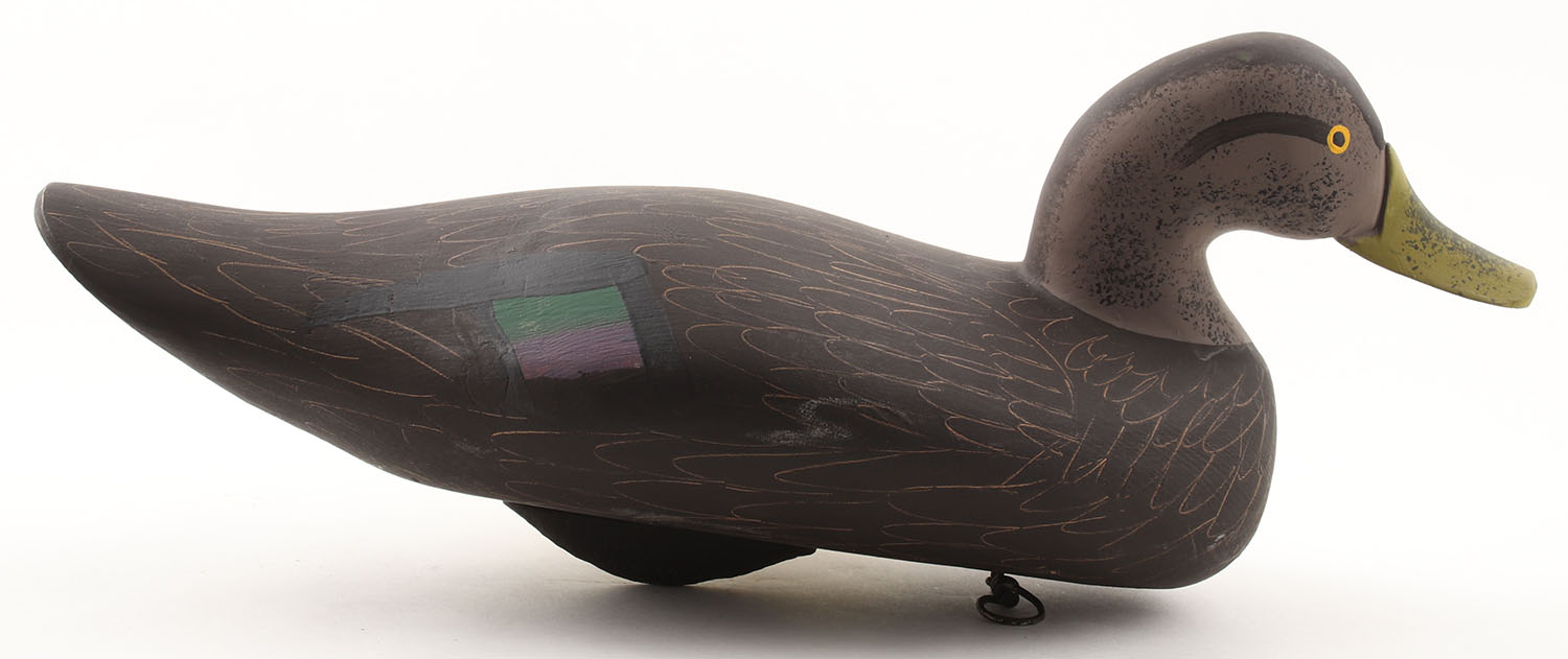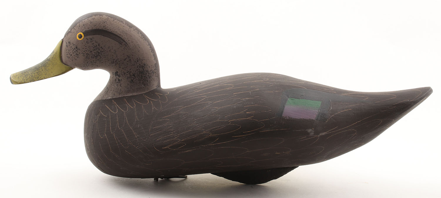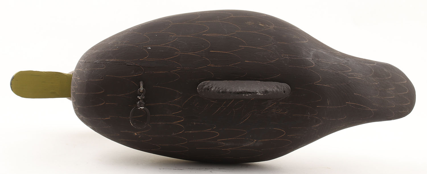 Black Duck by Captain Harry R. Jobes, 2004, painted eyes, solid wood, original paint, structurally excellent, signed on bottom CAPT. HARRY R. JOBES, 17'' OAL, potential pair with previous lot?. Grade: Excellent - Value: 100 to 200