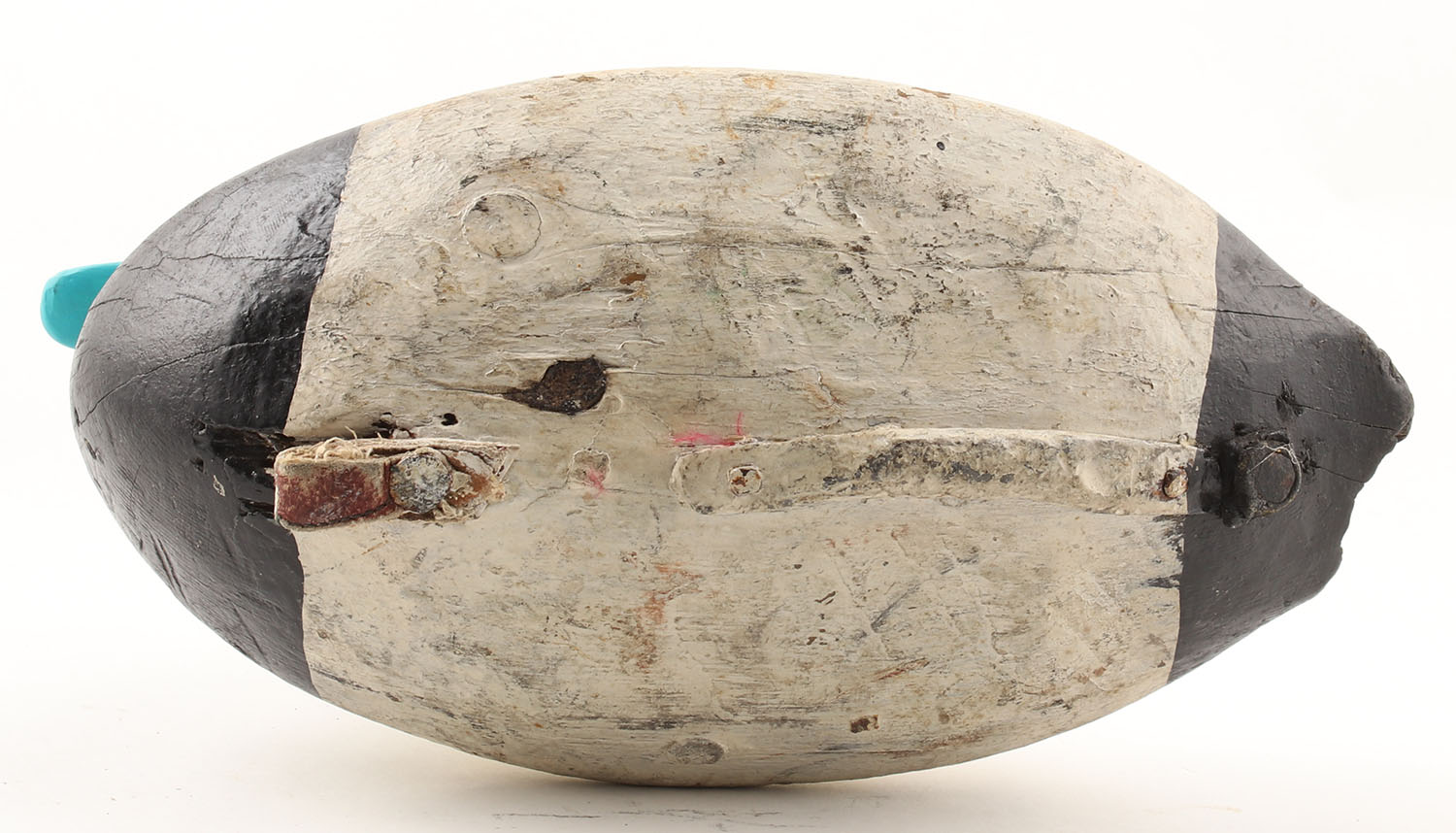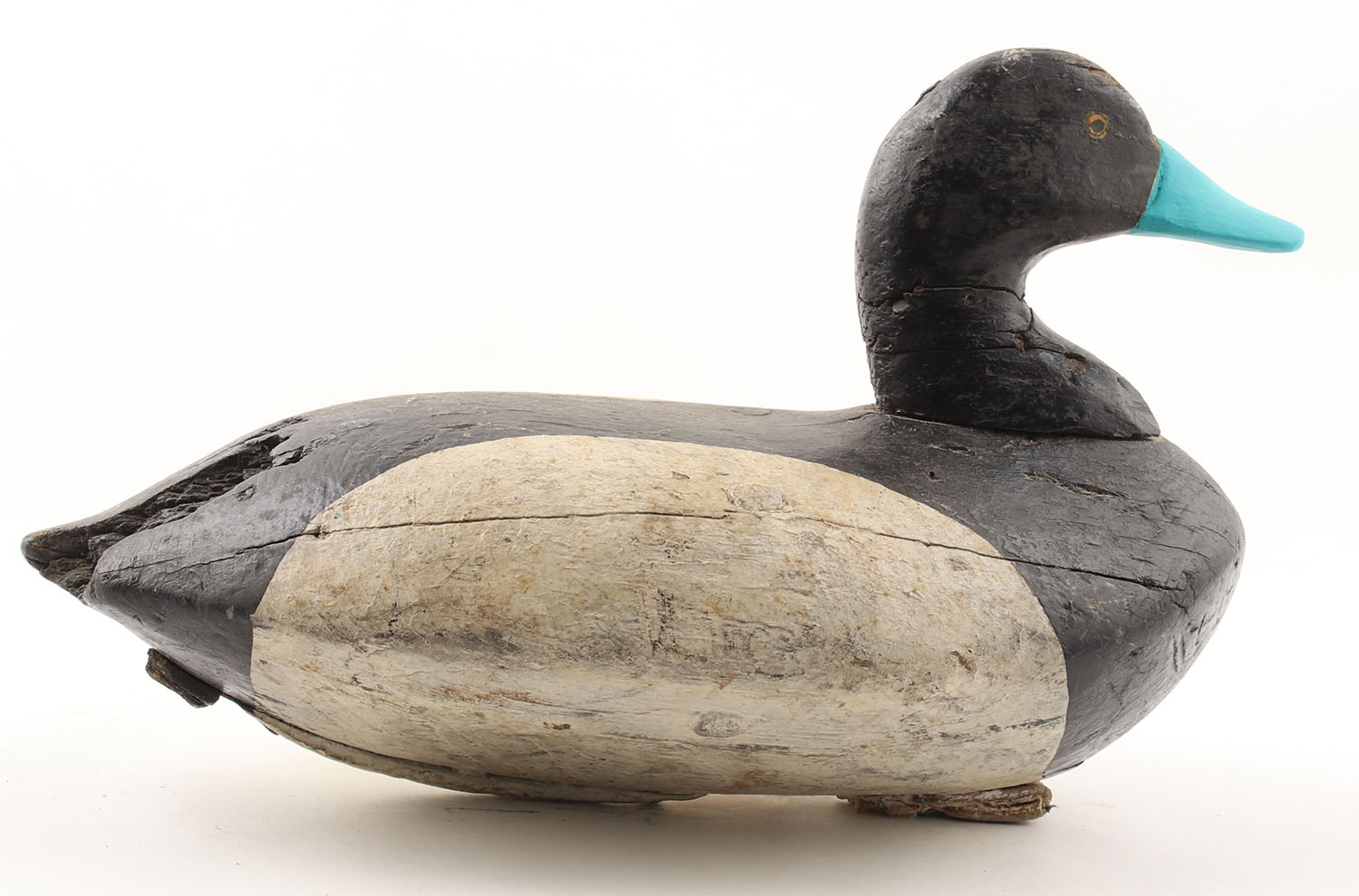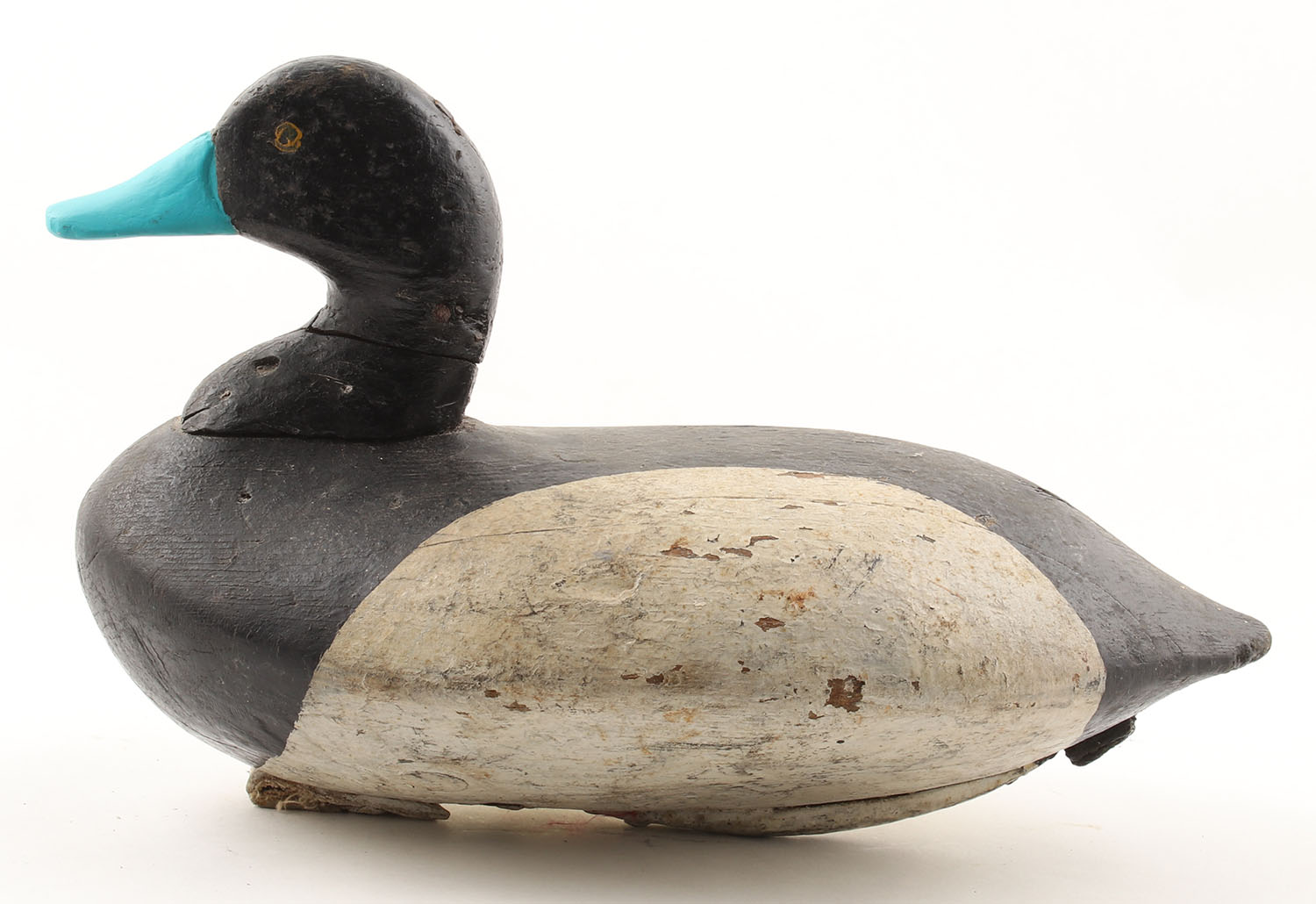 Bluebill Drake by Unknown Maker, painted eyes, solid wood, repaint, structurally sound, has a large chip, grain cracks, repaired neck, 12 1/2'' OAL. Grade: Good - Value: 20 to 40