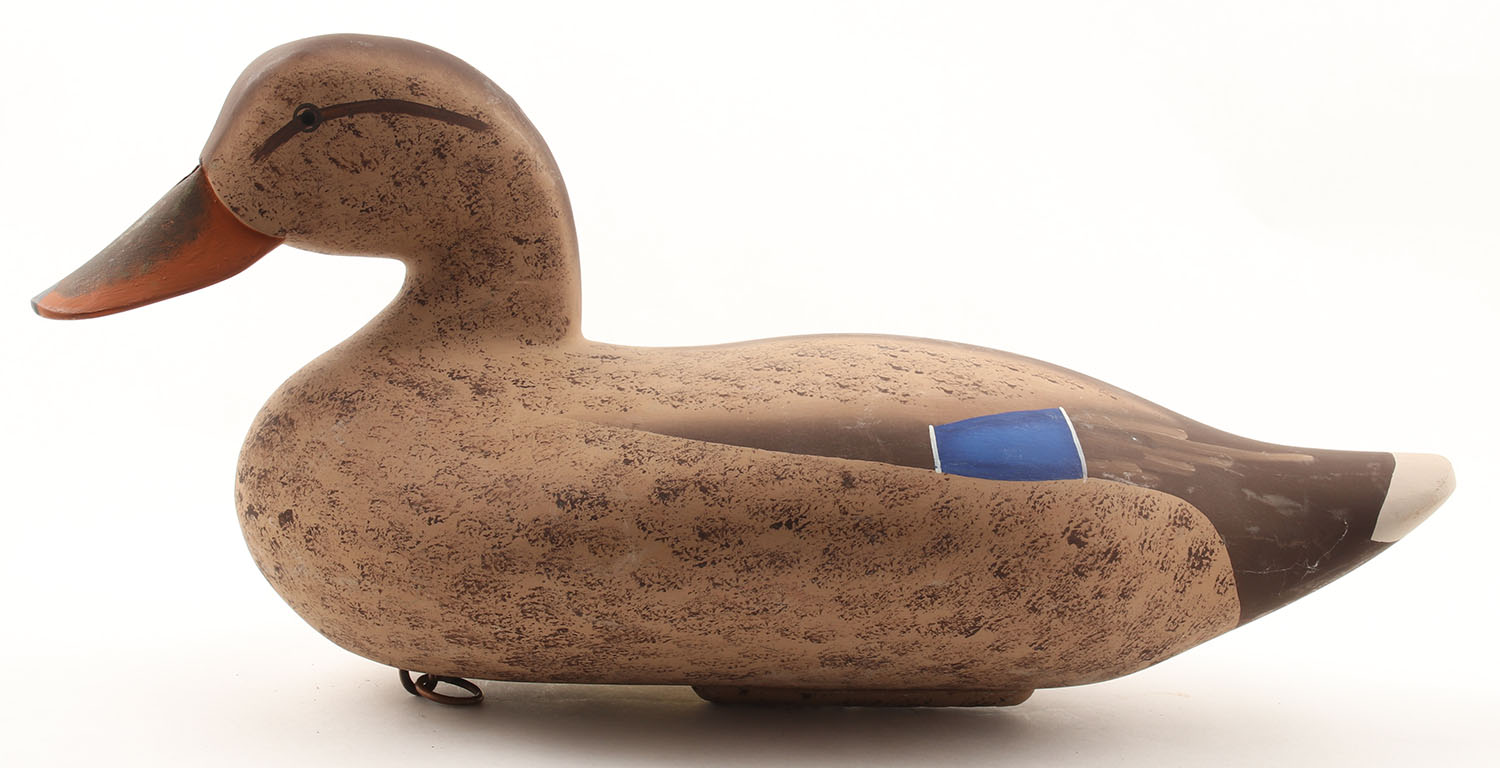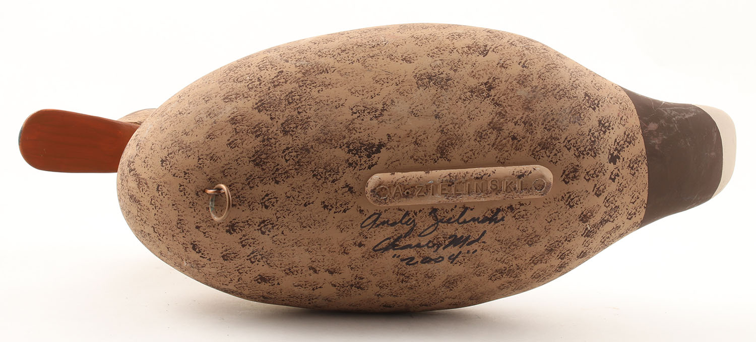 Mallard Hen by Andy Zielinski, Chase, MD, 2004, painted eyes, solid wood, original paint, structurally excellent, signed on bottom, name stamped on keel weight, 16'' OAL. Grade: Excellent - Value: 50 to 100