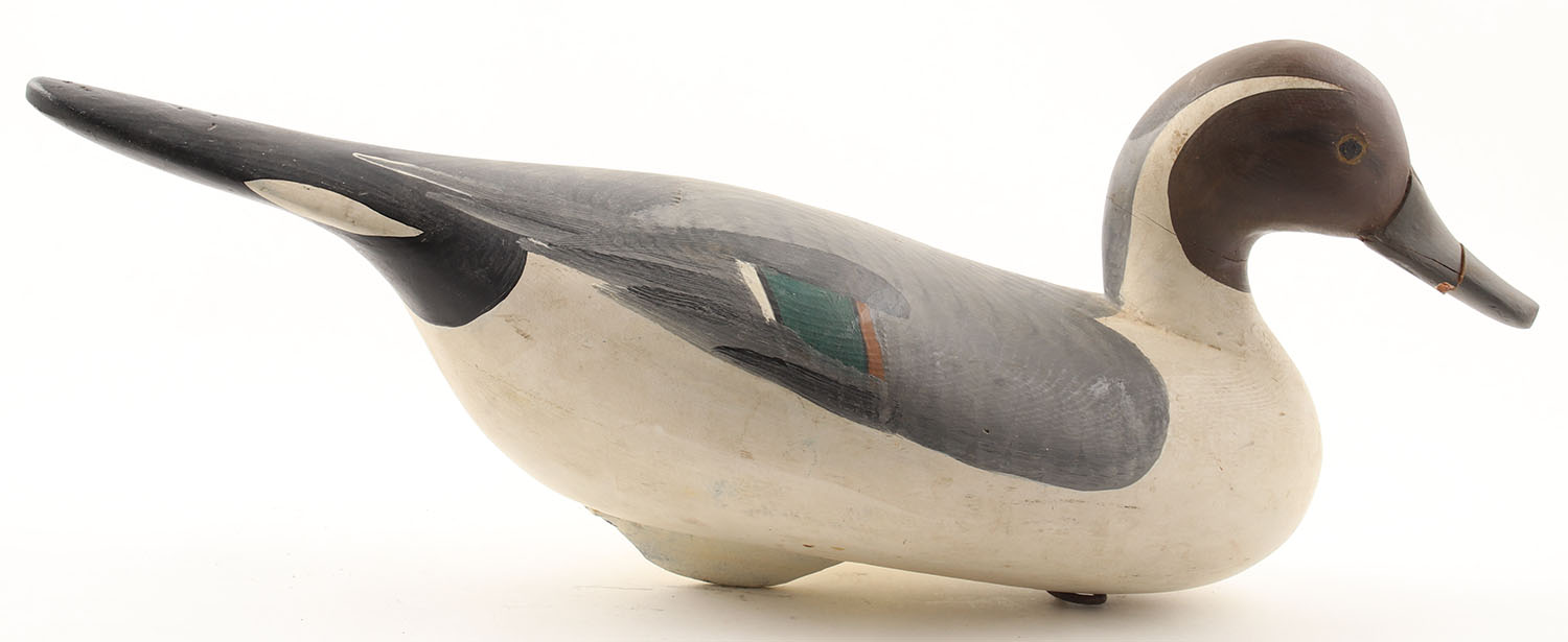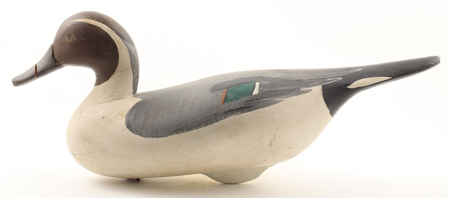 Pintail Drake by R. Madison Mitchell, Havre de Grace, MD, 1968, painted eyes, solid wood, original paint, partially repaired beak, tight hairline crack in neck, 18'' OAL. Grade: Good - Value: 50 to 100