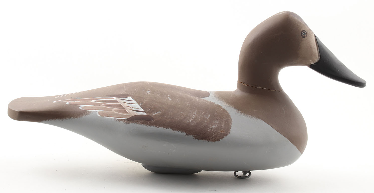 Canvasback Hen by Jeff Spencer, MD, painted eyes, solid wood, original paint, crack in neck, appears to be repaired with glued dowel, marked ''SPENCER'' on bottom, 16'' OAL. Grade: Excellent - Value: 40 to 80