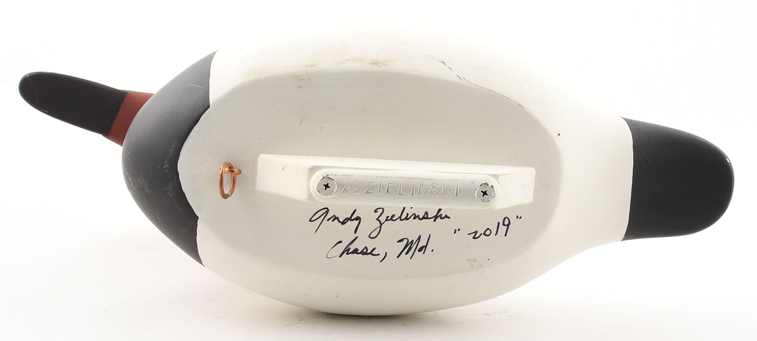 Canvasback Drake (with high neck) by Andy Zielinski, Chase, MD, 2019, painted eyes, solid wood, original paint, structurally excellent, signed on bottom, 17'' OAL. Grade: Excellent - Value: 50 to 150