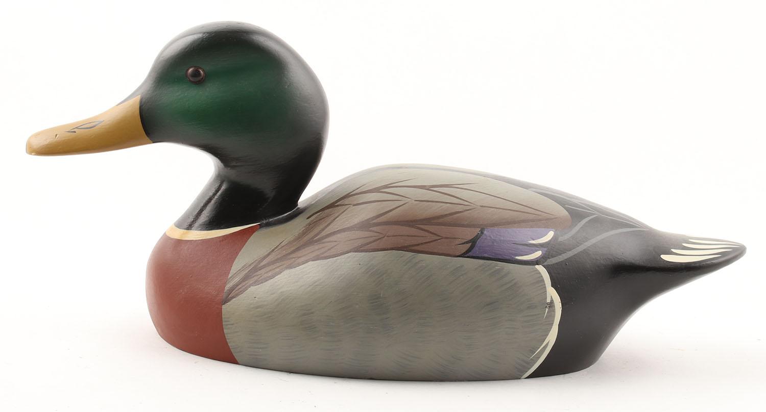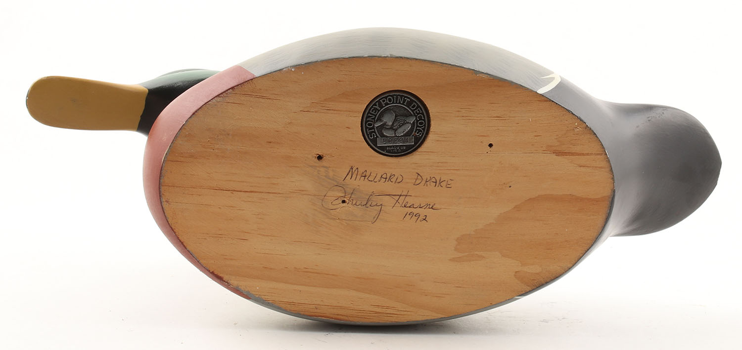 Mallard Drake by Shirley Hearne, Stoney Point Decoys, 1992, #53524, glass eyes, solid wood, original paint, signed on bottom, has Stoney Point coin, 14 1/2'' OAL. Grade: Excellent - Value: 30 to 60