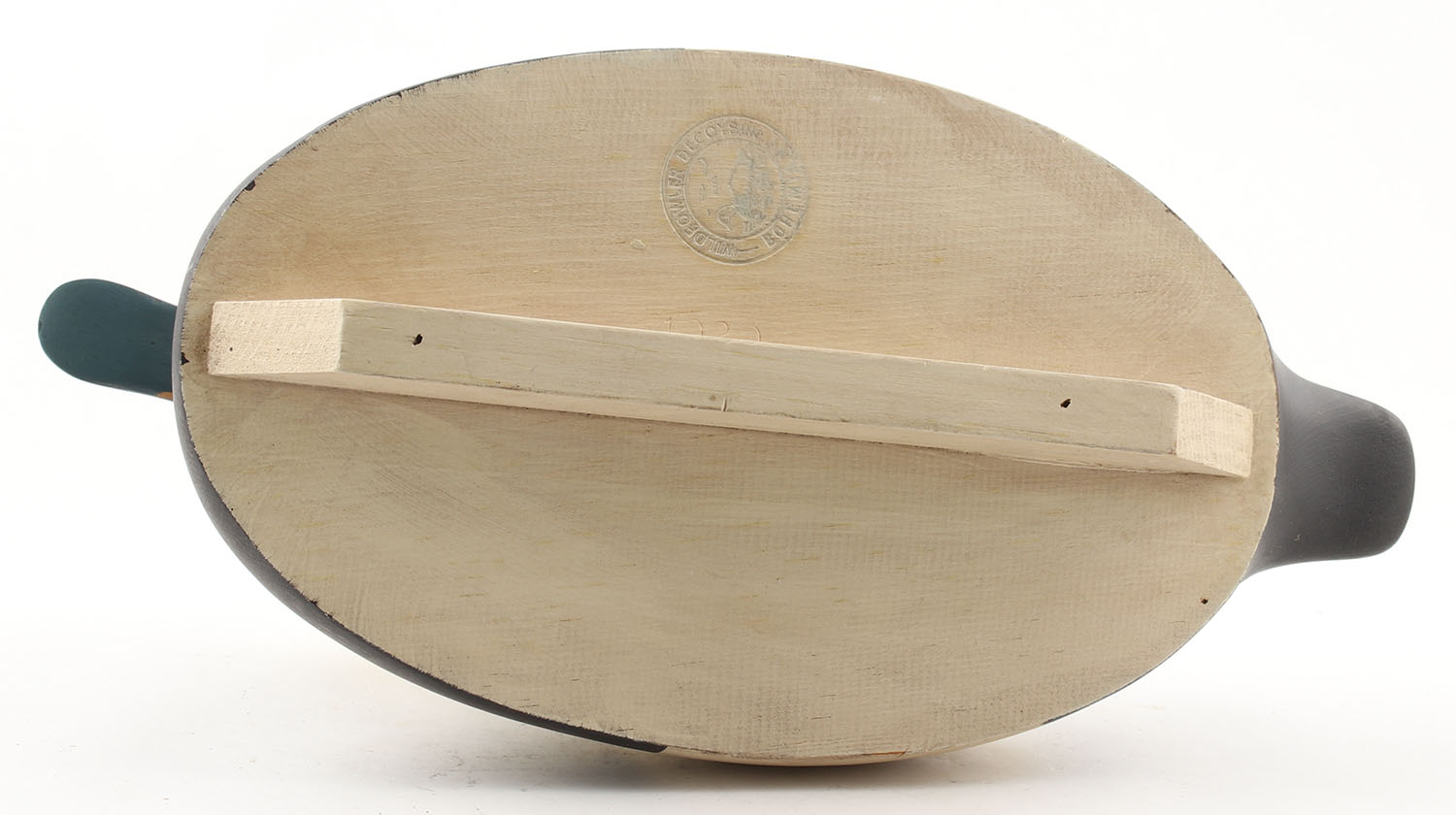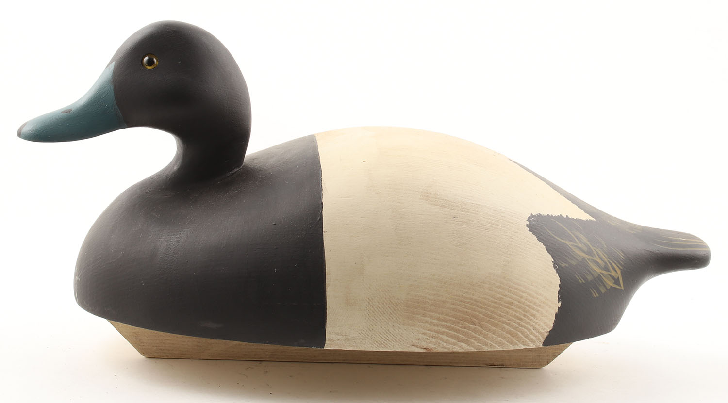 Bluebill Drake by Wildfowler Decoys Inc., Bohem, NY, #1020, glass eyes, solid wood, original paint, company seal stamped on bottom, 15'' OAL. Grade: Excellent - Value: 40 to 80