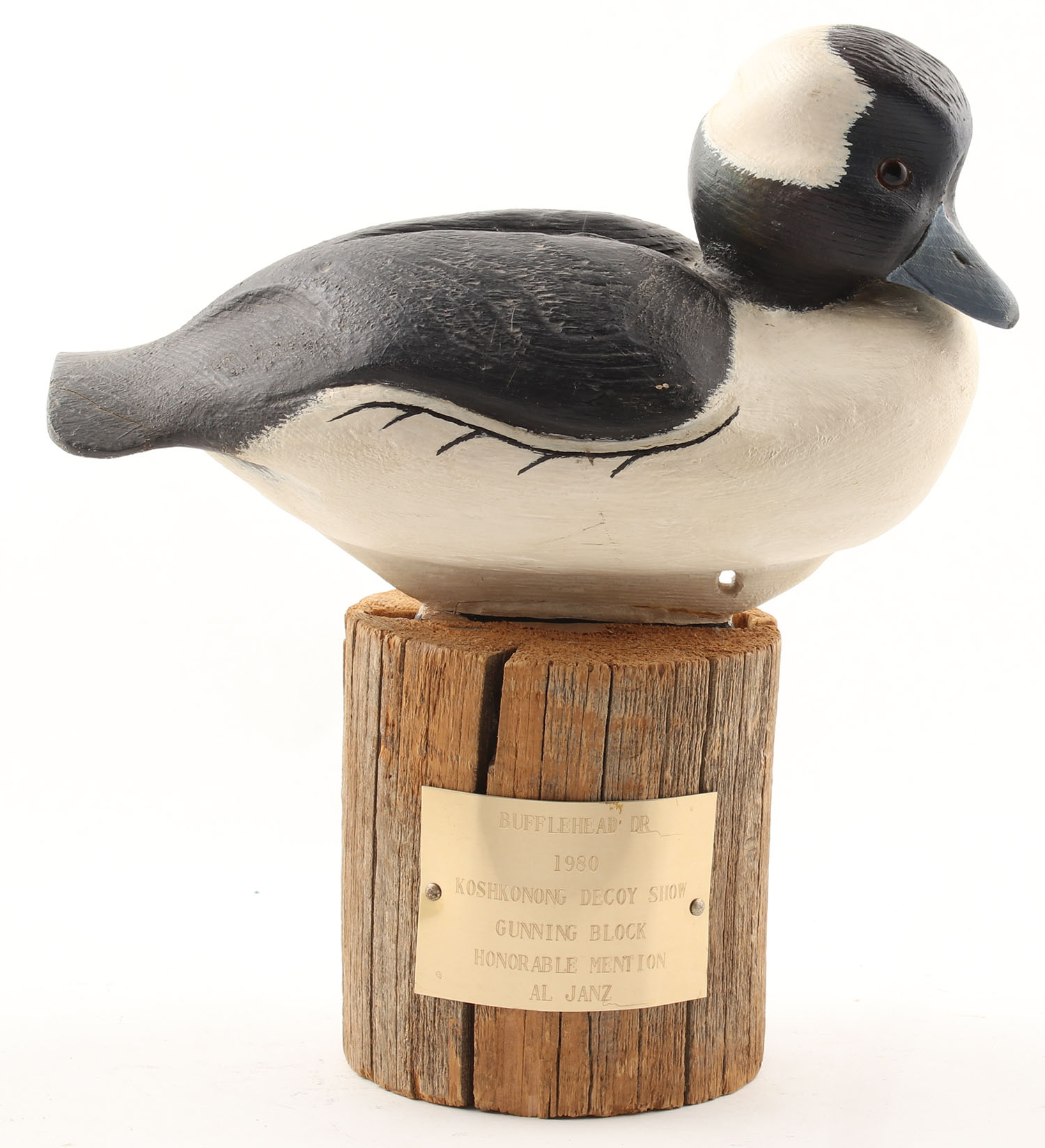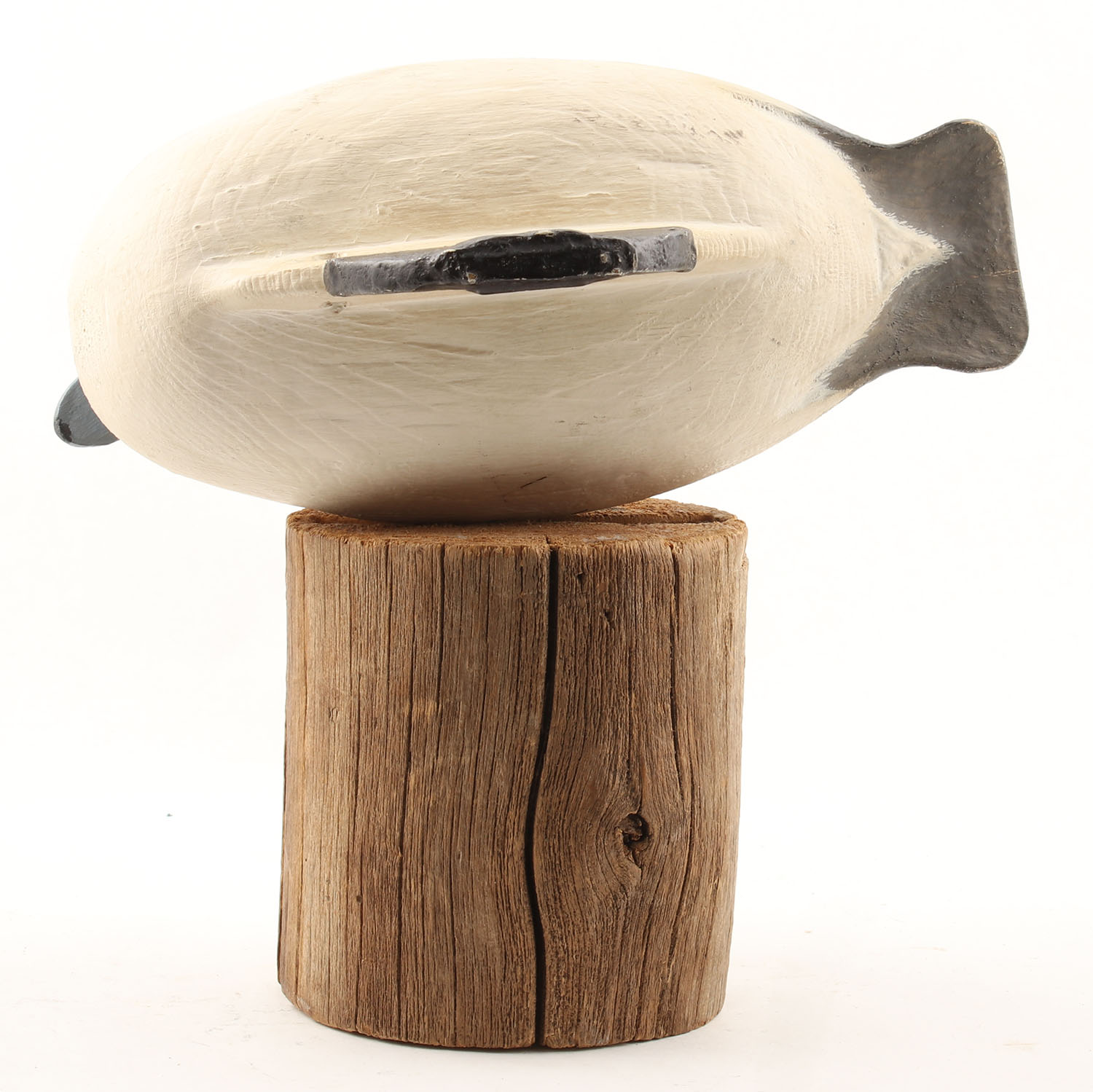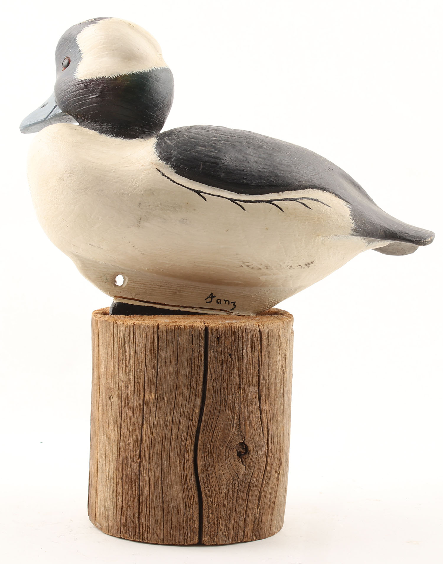Bufflehead Drake by Unknown Maker, glass eyes, hollow wood, original paint, glue repaired keep & small crack on right side of tail, 10'' OAL. Grade: Very Good - Value: 20 to 40