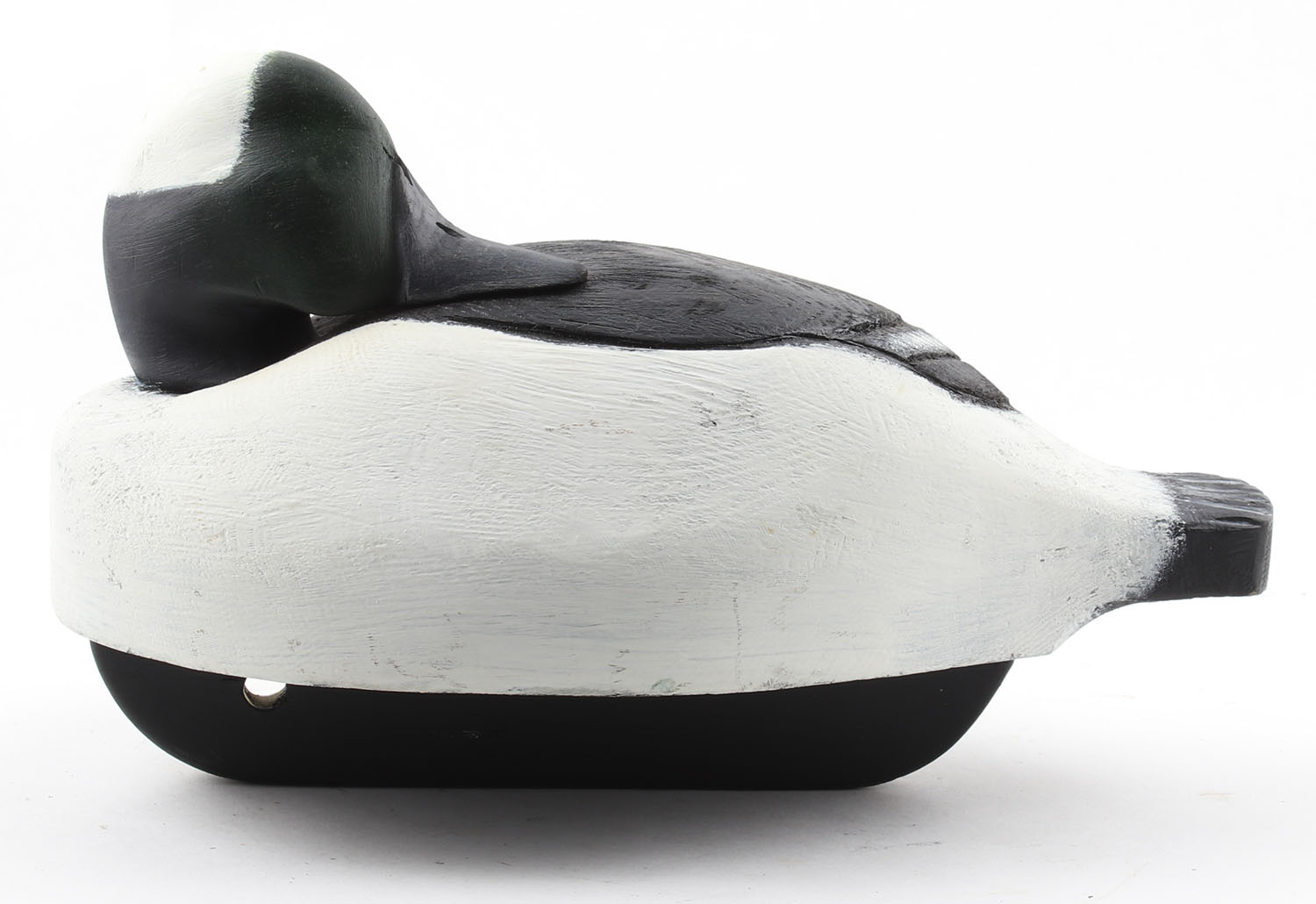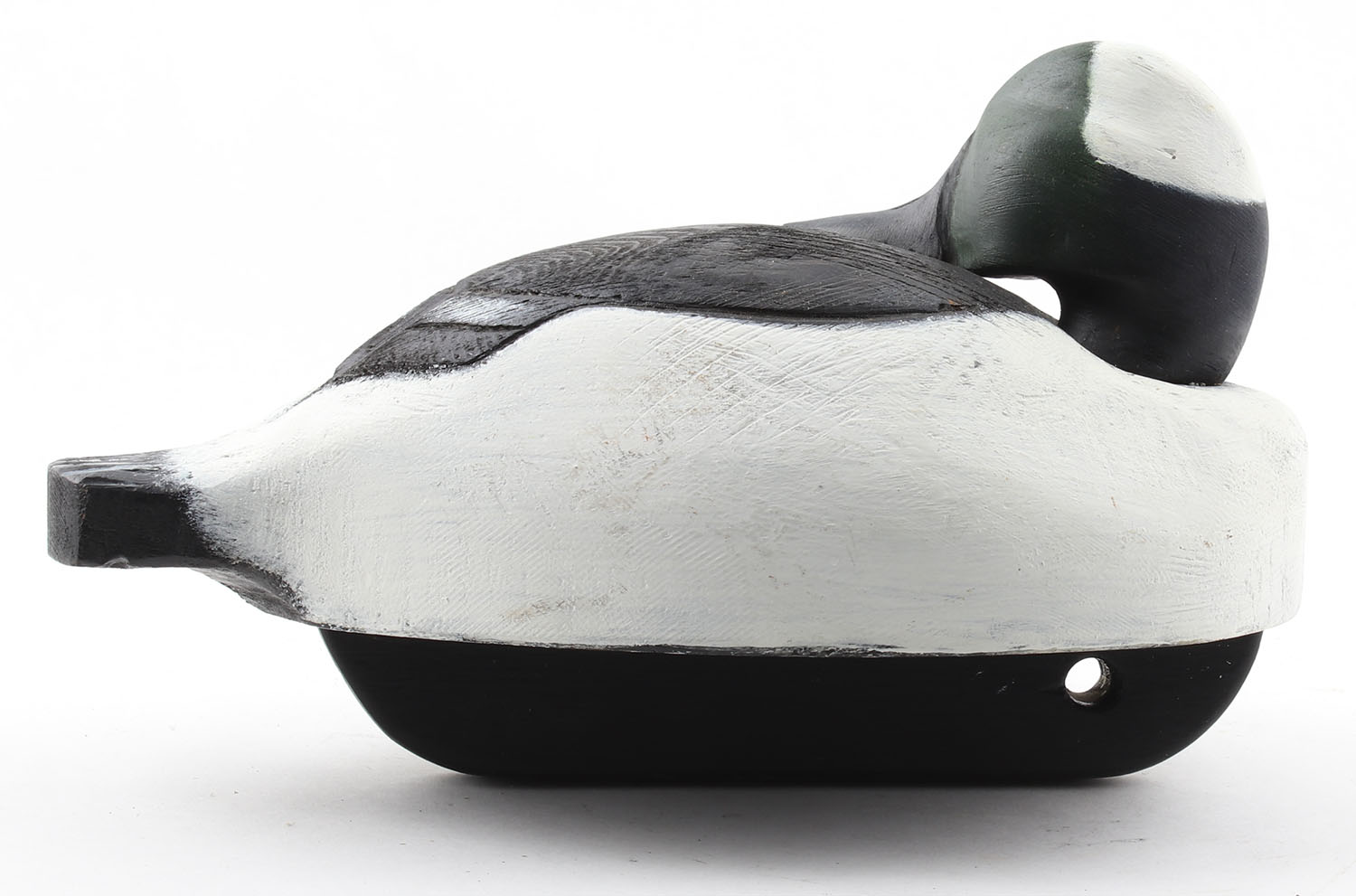 Preening Bufflehead Drake by BH, no eyes, solid wood, original paint, marked on bottom, 12'' OAL. Grade: Excellent - Value: 30 to 60