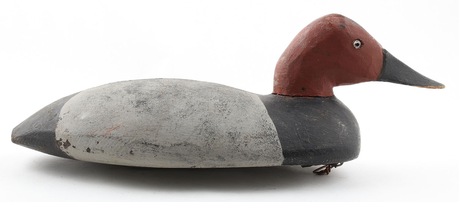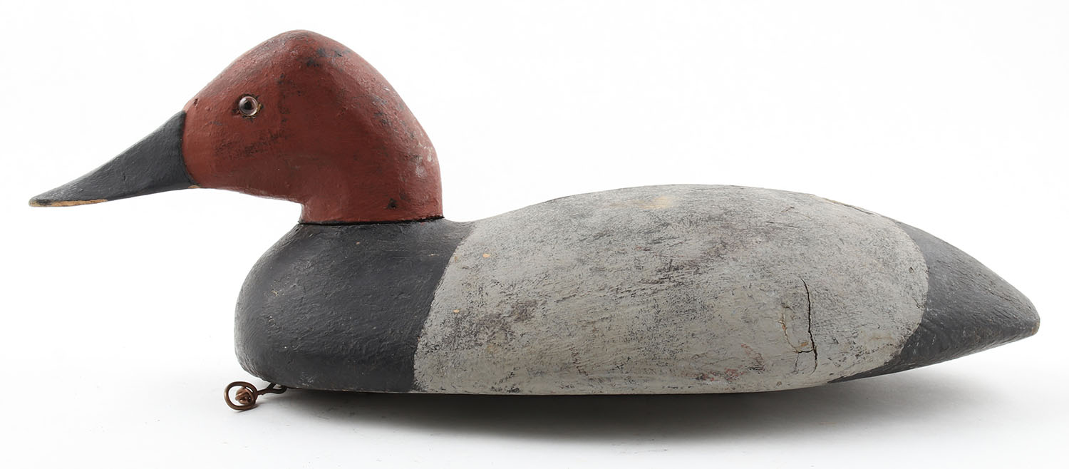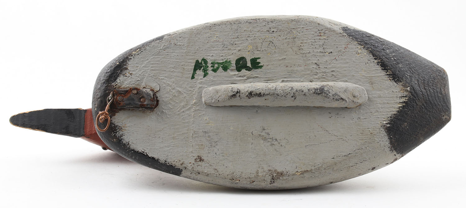 Canvasback Drake by Moore, glass eyes, solid wood, repaint, crack down the top of the back & on the left side, 17'' OAL. Grade: Fair - Value: 10 to 40