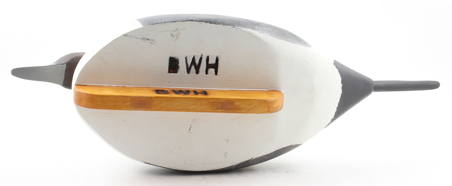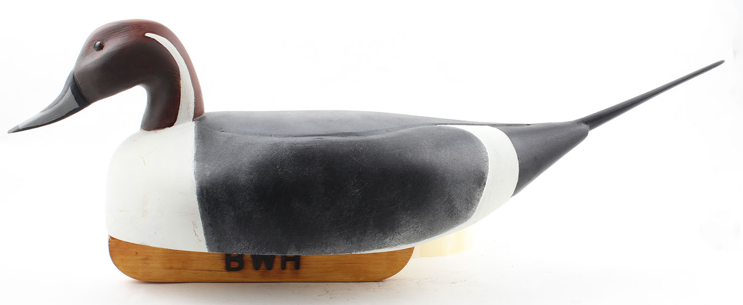 Pintail Drake by BWH, glass eyes, solid wood, original paint, structurally excellent, marked on bottom, 24'' OAL. Grade: Excellent - Value: 50 to 100