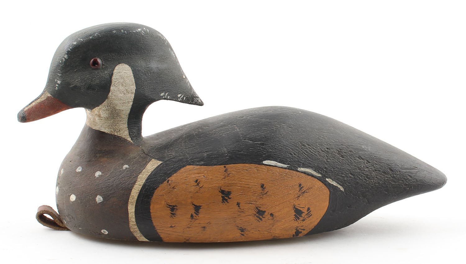 Woodduck Drake by Unknown Maker, glass eyes, solid wood, original paint, structurally excellent, 13 1/2'' OAL. Grade: Excellent - Value: 30 to 60