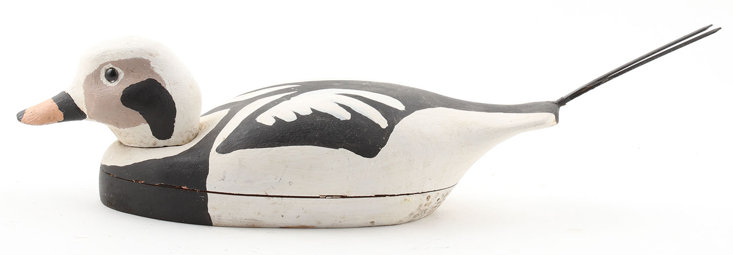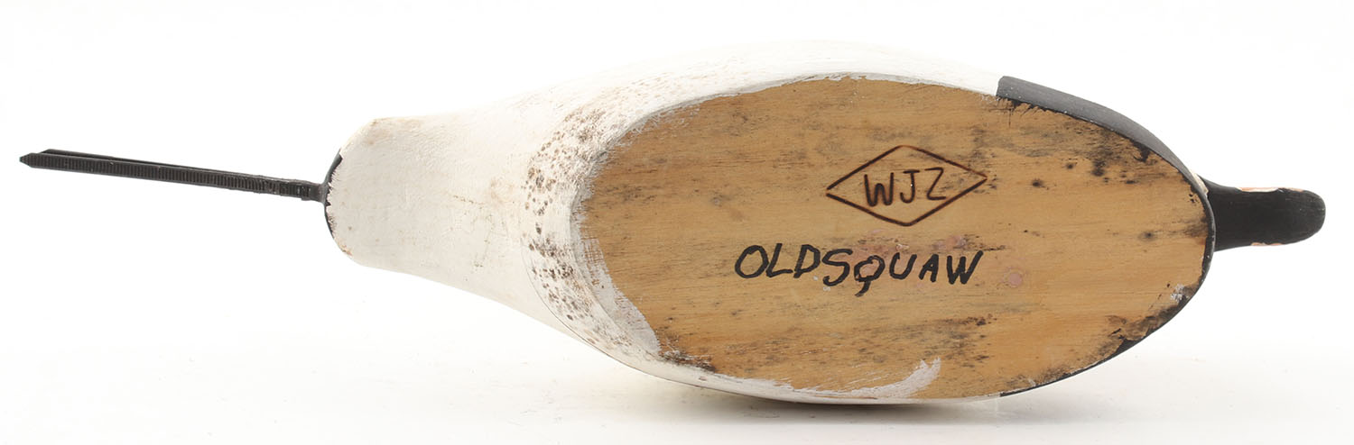 Old Squaw Drake by WJZ, glass eyes, hollow wood, original paint, body split on left side, zip tie tail, 15 1/2'' OAL. Grade: Very Good - Value: 20 to 60