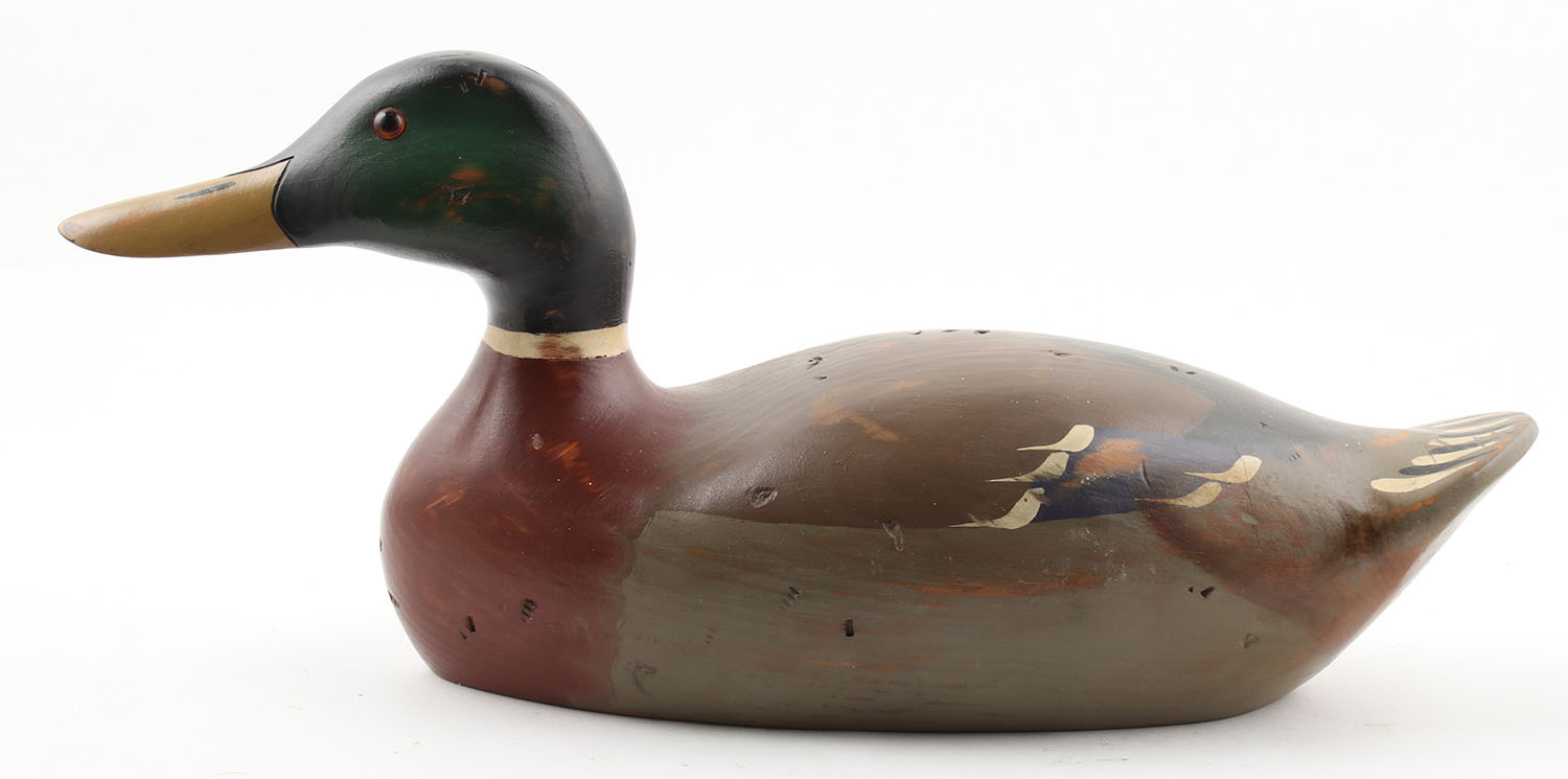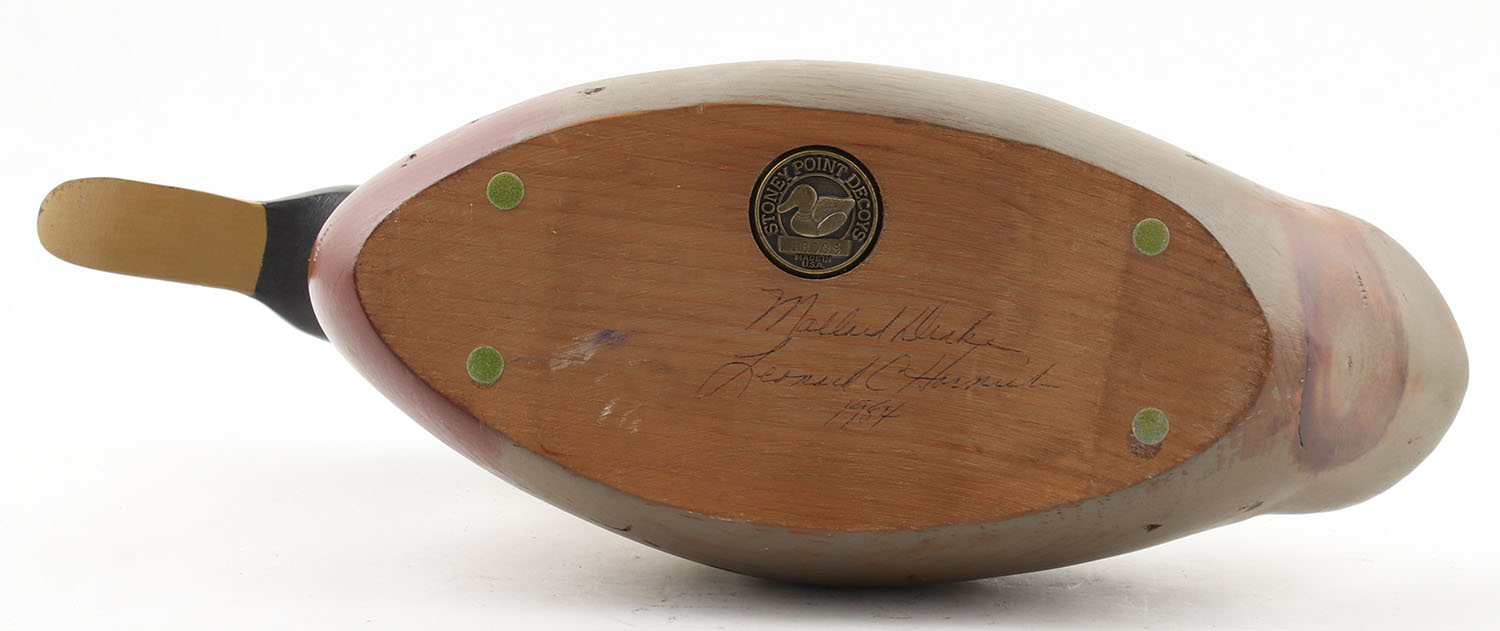 Mallard Drake by Leonard Hornick, 1984, Stoney Point Decoys, #18095, glass eyes, solid wood, original paint with intentional distress features, structurally excellent, 16'' OAL. Grade: Excellent - Value: 40 to 80