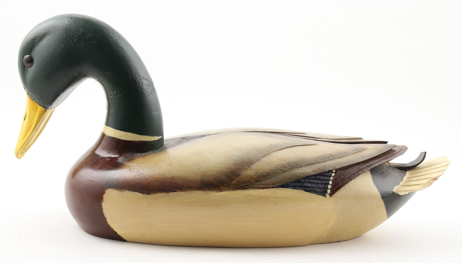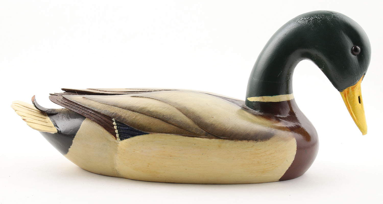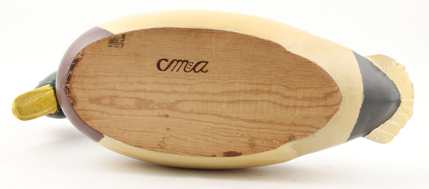 Mallard Drake by CMA, glass eyes, solid wood, original paint, couple small chips near tail, otherwise excellent, 16'' OAL. Grade: Excellent - Value: 30 to 80