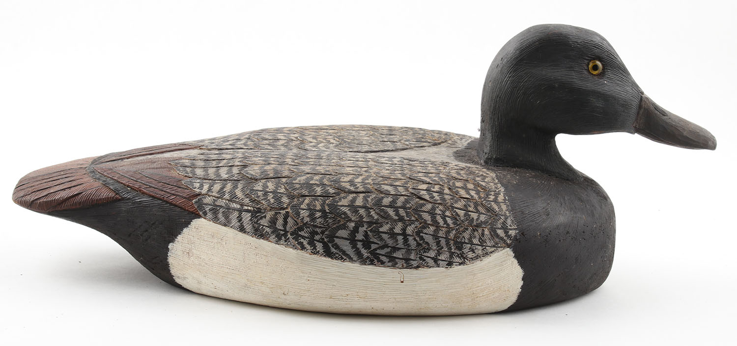 Bluebill Drake by E.W Fisher, 1978, glass eyes, solid wood, original paint, nice detail, structurally excellent, 16 1/2'' OAL. Grade: Excellent - Value: 40 to 80