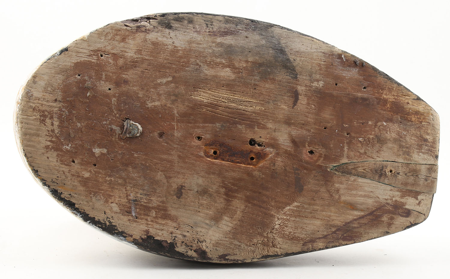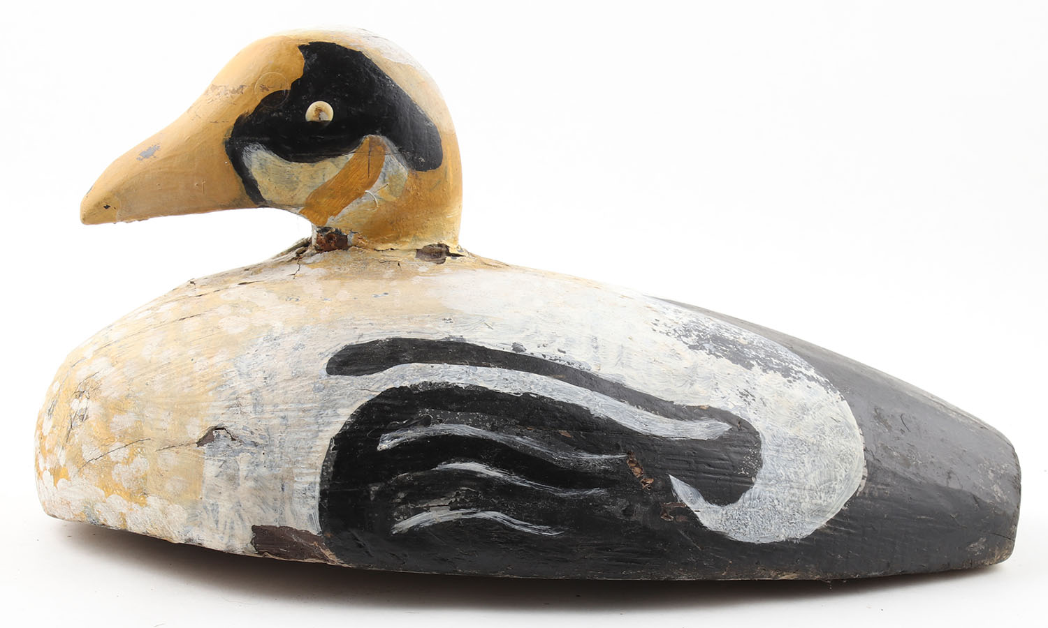 Eider by Unknown Maker, raised painted eyes, solid wood, original paint, cracking to paint around base of neck, wedge repair on bottom, 14'' OAL. Grade: Good - Value: 10 to 40
