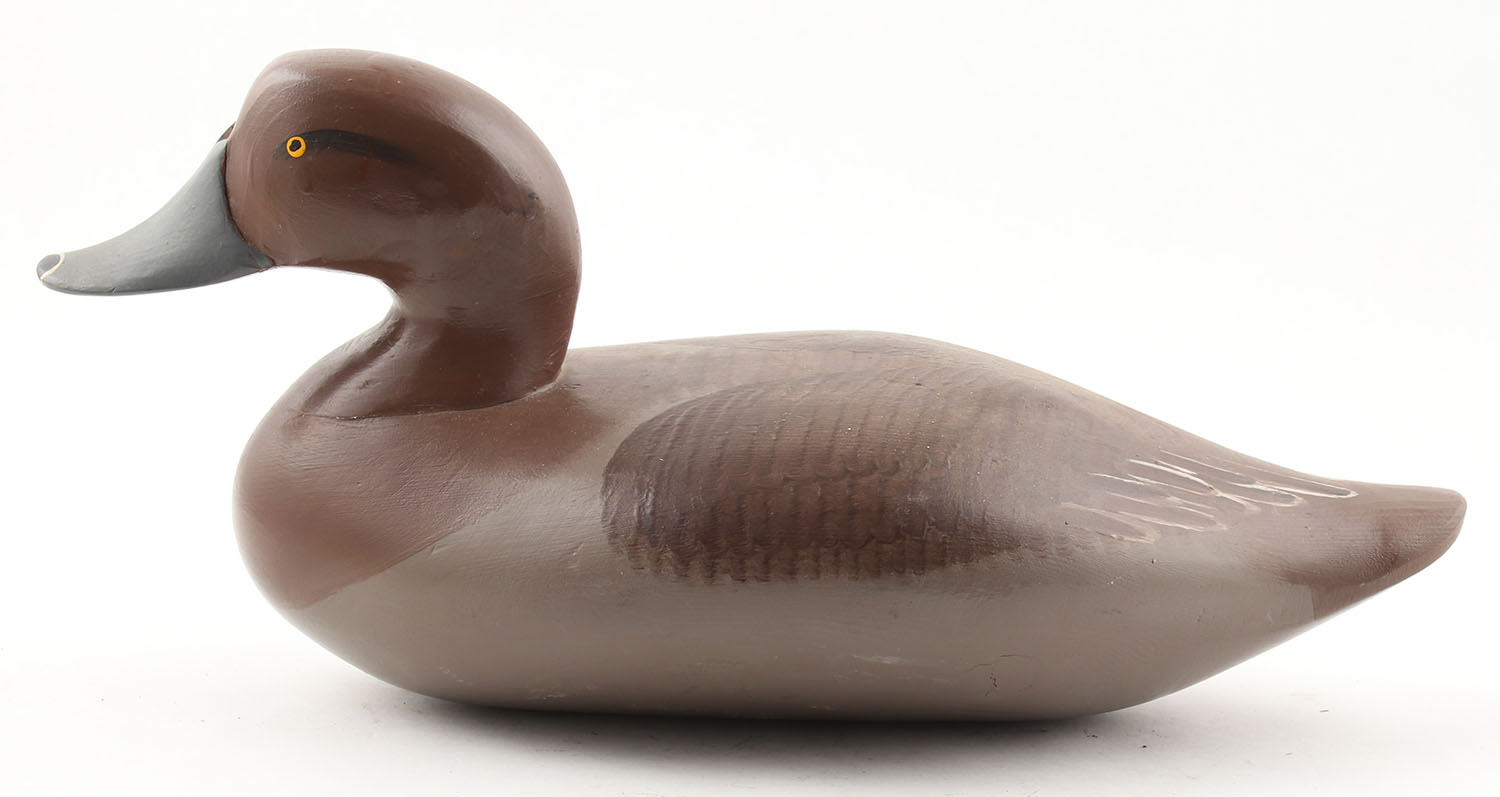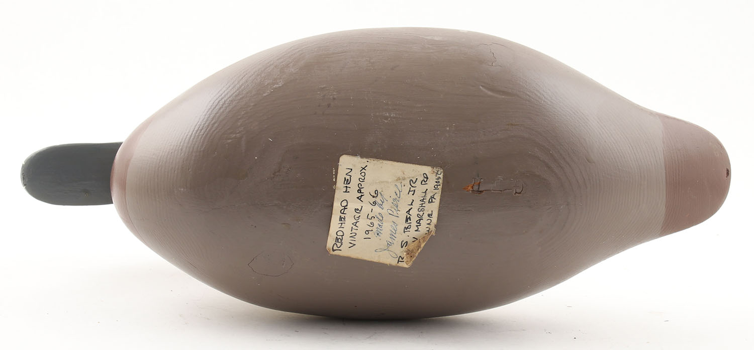 Bluebill Hen by James Pierce, Lansdowne, PA, 1965-66, painted eyes, solid wood, original paint, structurally excellent, stamped ''GFH'' on bottom, 14 1/2'' OAL. Grade: Excellent - Value: 40 to 80