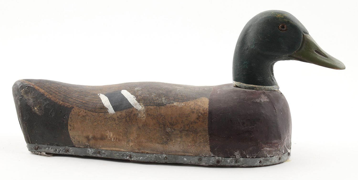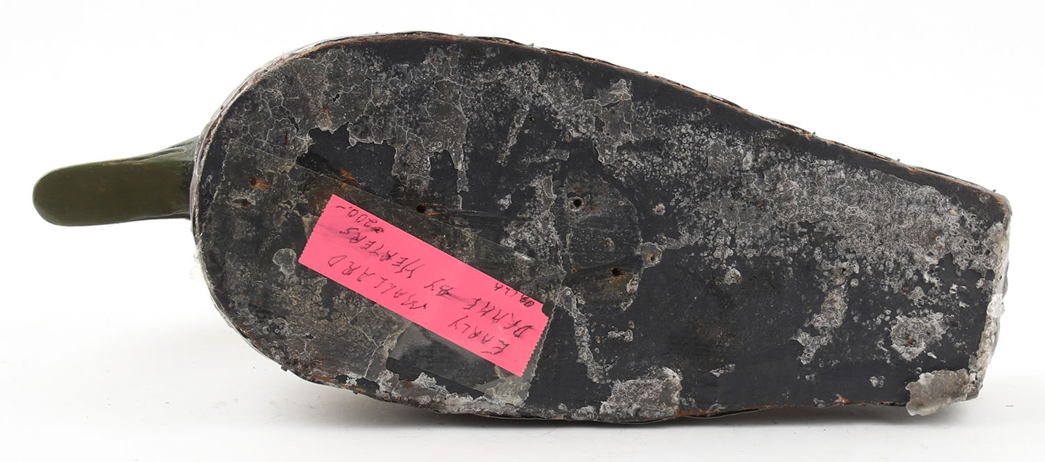 Early Mallard Drake by Herter's Decoy Co., Waseca, MN, glass eyes (have small cracks), painted canvas over wood or cork?, metal band around bottom, original paint, structurally excellent, wax layer on bottom, 14'' OAL. Grade: Very Good++ - Value: 100 to 400