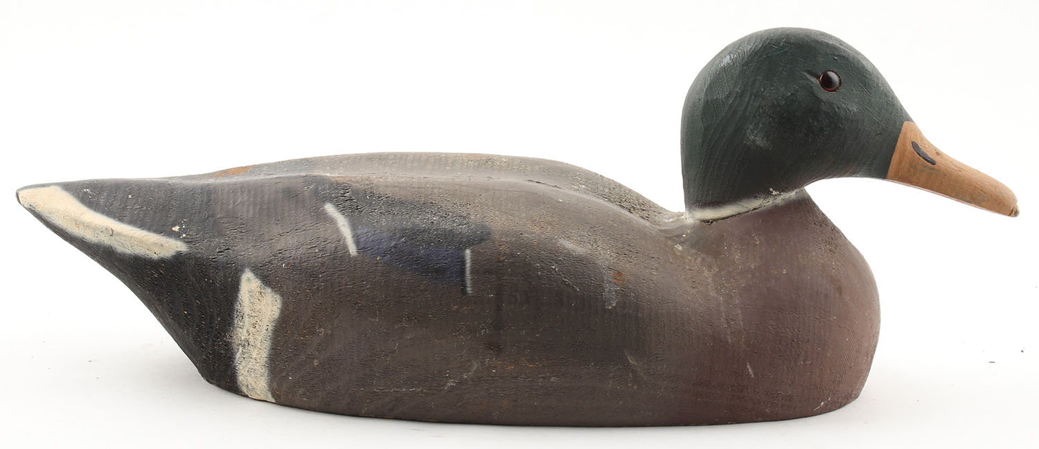 Mallard Drake by Herter's Inc, Waseca, MN, 1893 Series, glass eyes, solid wood, original paint, structurally excellent, stamped on bottom, 15'' OAL. Grade: Excellent - Value: 50 to 400