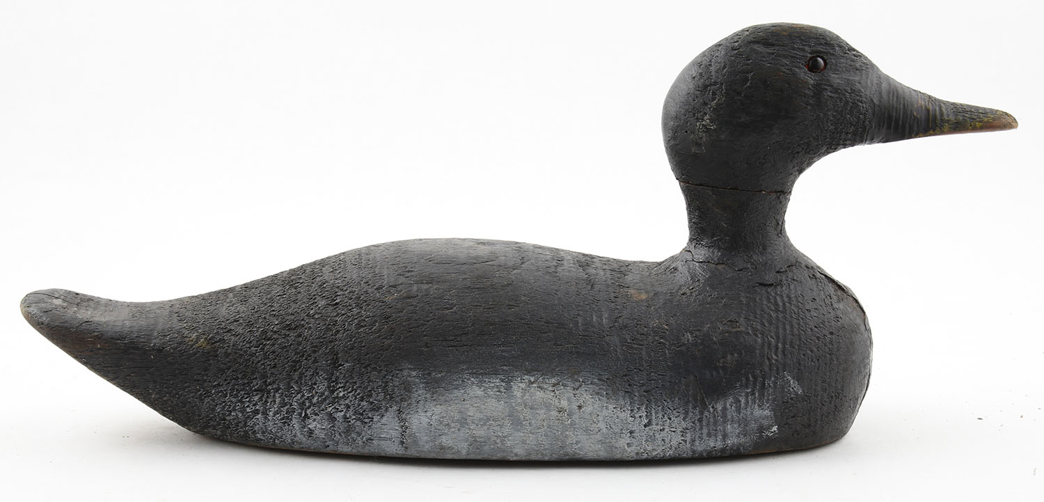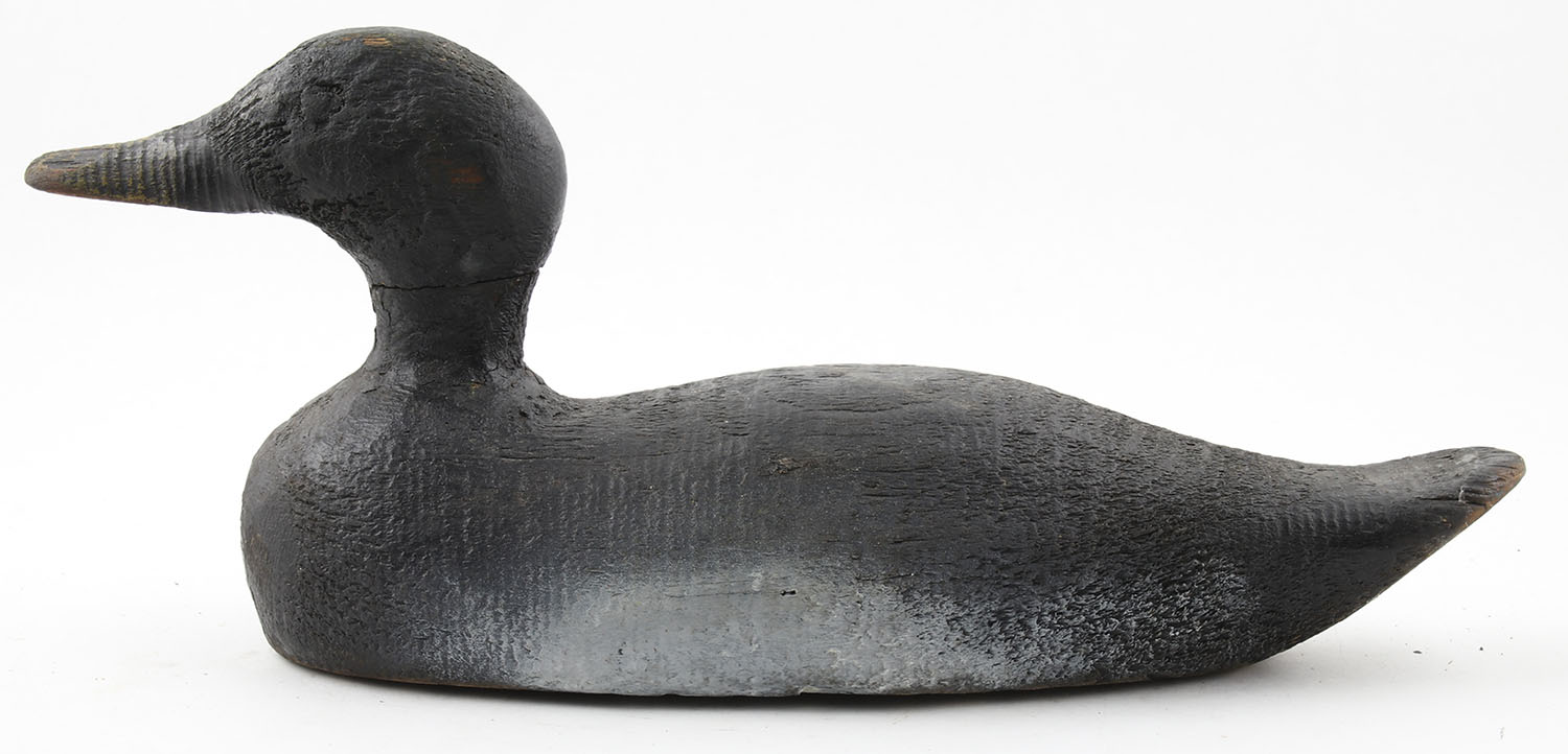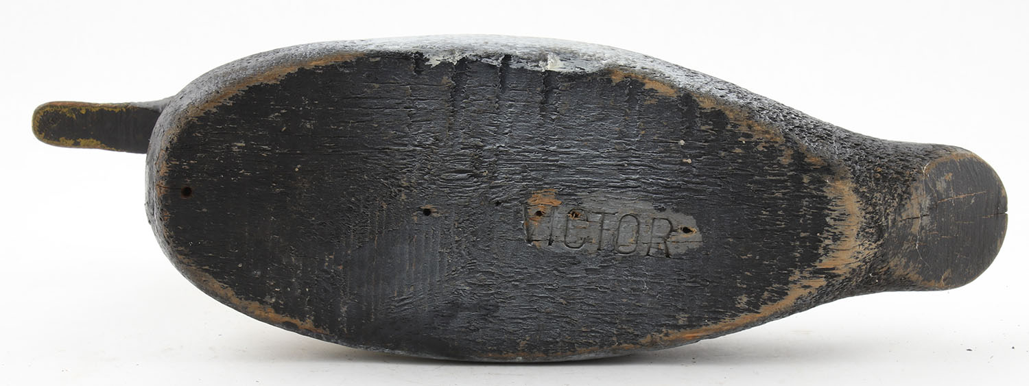 Bluebill Drake by Victor, glass eye (left eye missing), solid wood, repaint, a few grain cracks & crack around neck, overall still structurally sound, 16 1/2'' OAL. Grade: Very Good - Value: 16 to 40