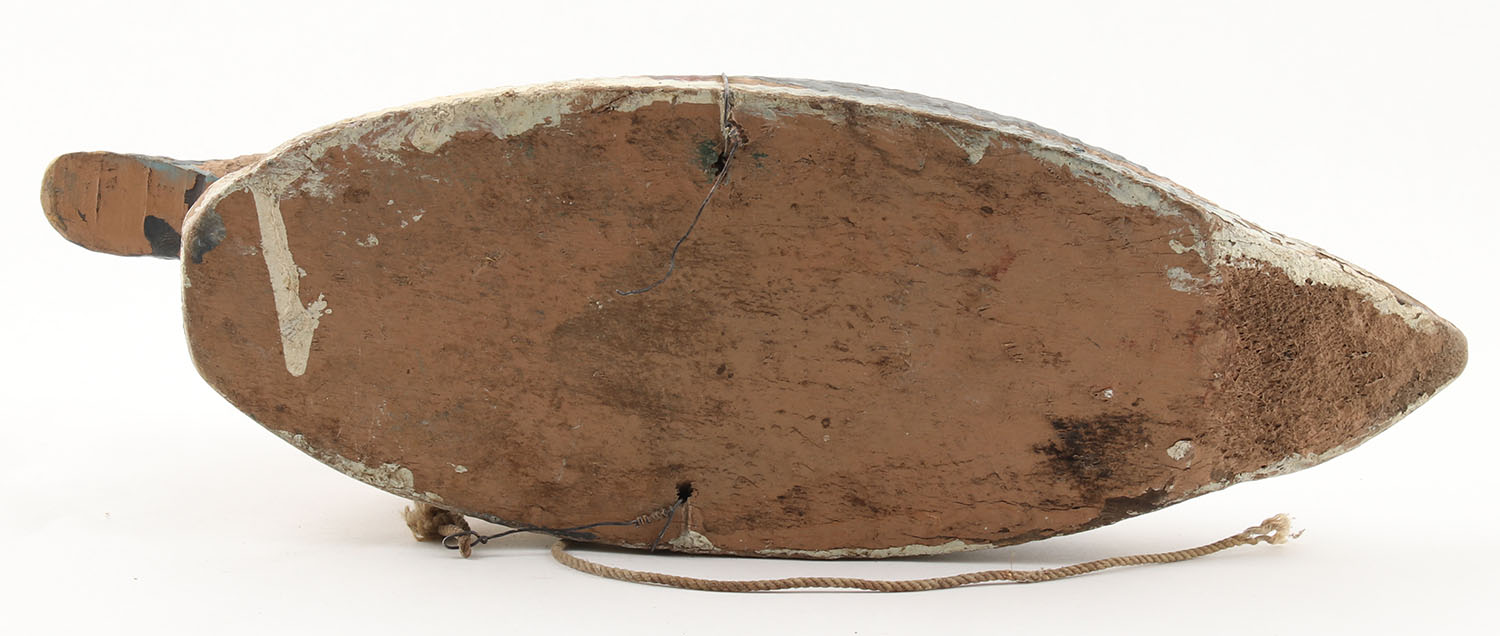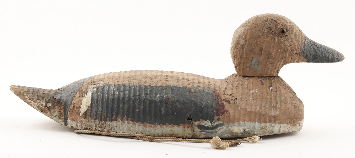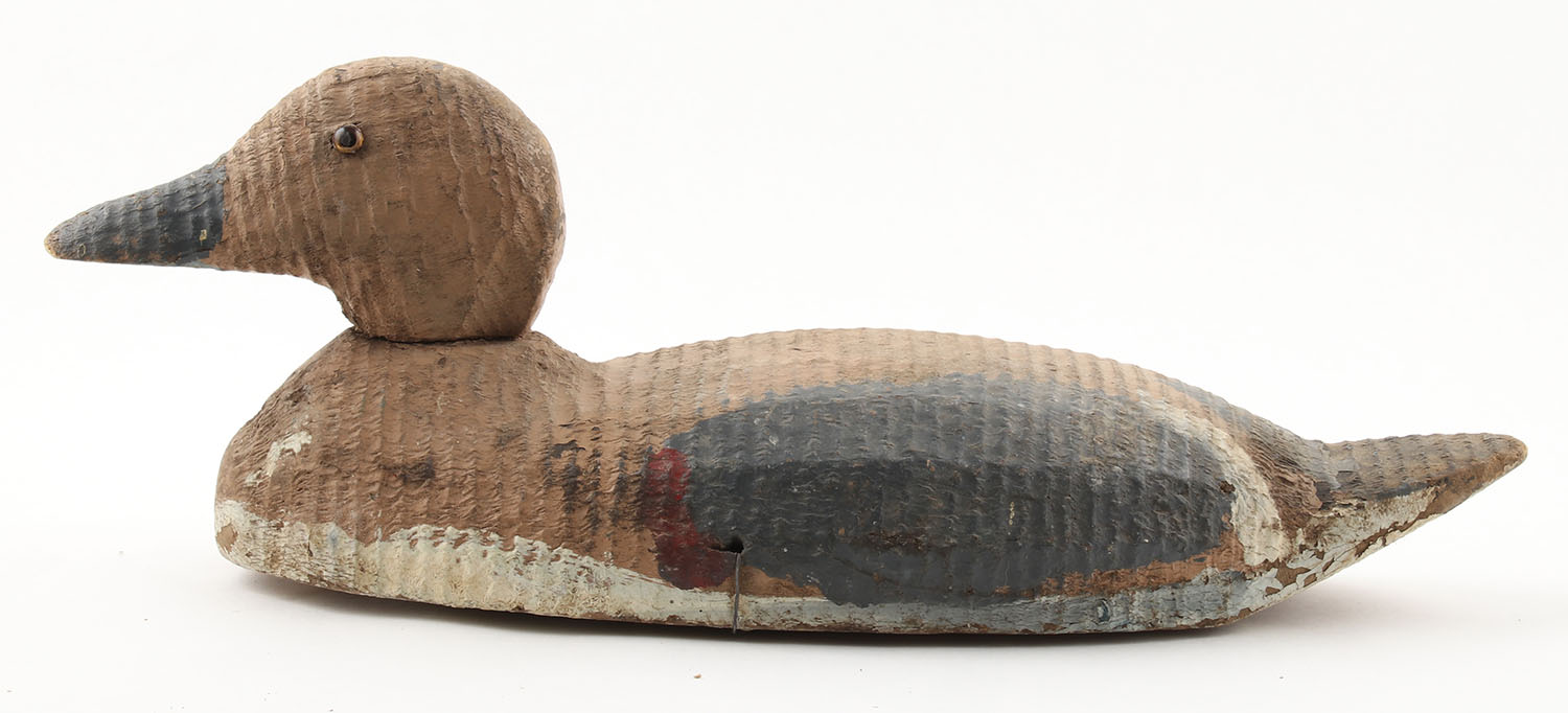 Bluebill Hen by Unknown Maker, glass eyes, solid lathed wood, original paint, structurally sound, 16'' OAL. Grade: Good++ - Value: 10 to 40